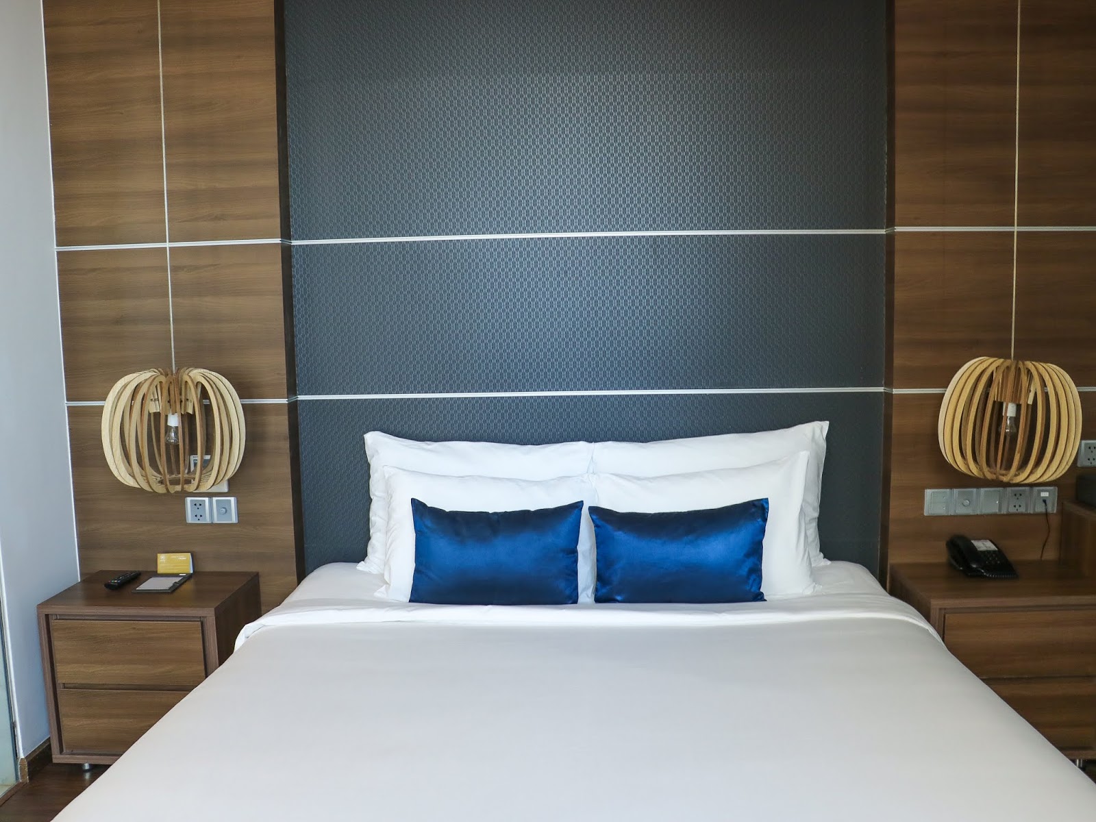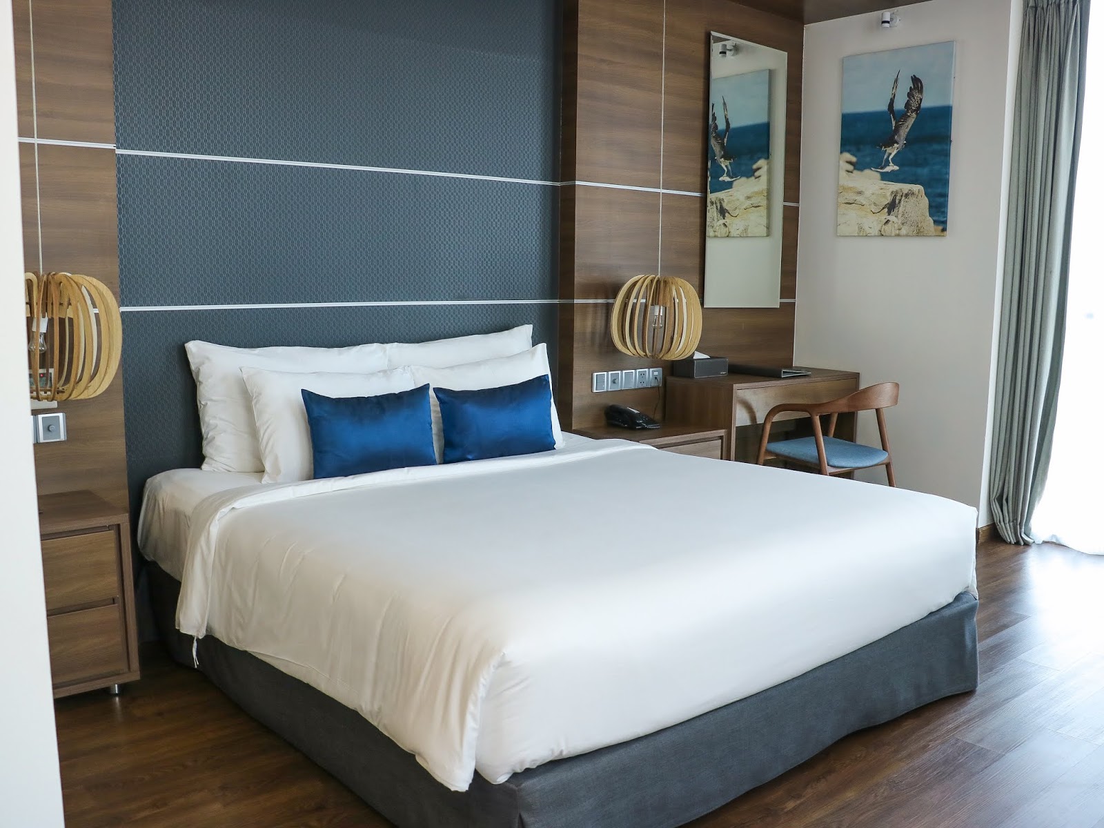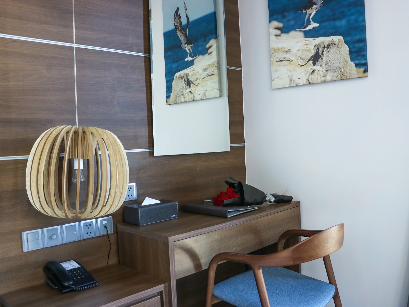 我訂的是局部海景高級雙人房,每晚房價大概港幣$650(連稅),包早餐,可使用飯店游泳池。 房間以海洋風主題,木傢具為主,簡約舒適。雖然話是局部海景高級雙人房,但是拉開窗簾看見的海景闊度也是滿有驚喜的,然而房間就相對君主飯店細一點。