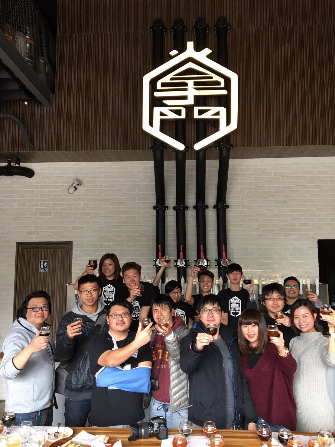 店內裝潢照,挑高六米的屋頂,營造很有氣勢的掌門LOGO搭配工業風送酒管線,整個很舒服的配色又不會讓人覺得不適。