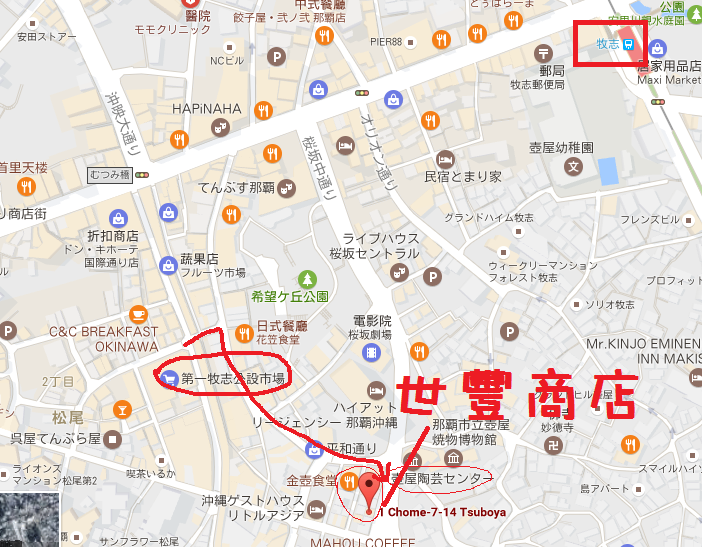 圈起來的牧志車站就是國際通的頭囉!紅紅的整條就是國際通大街,非常簡單吧!!!
