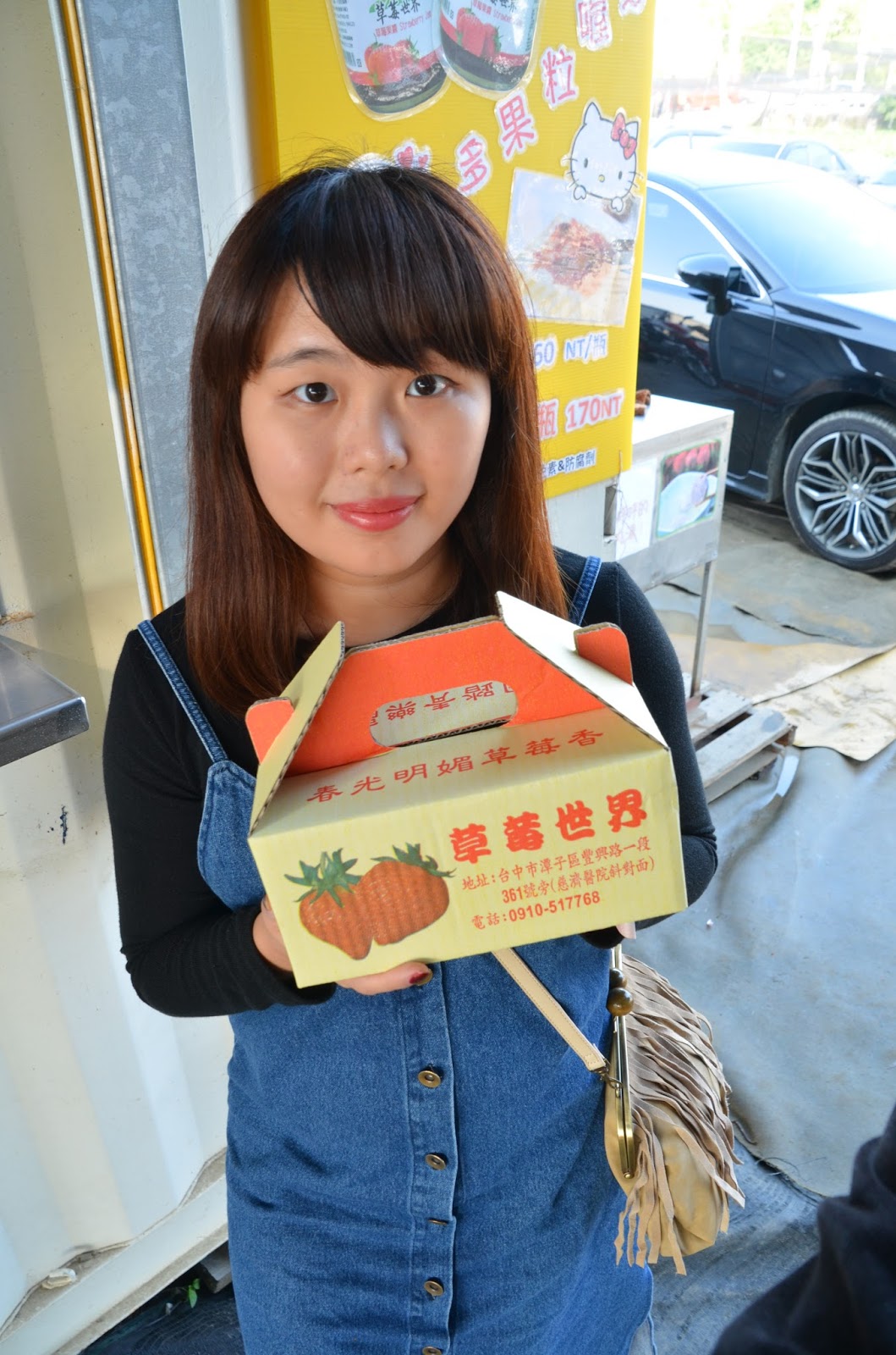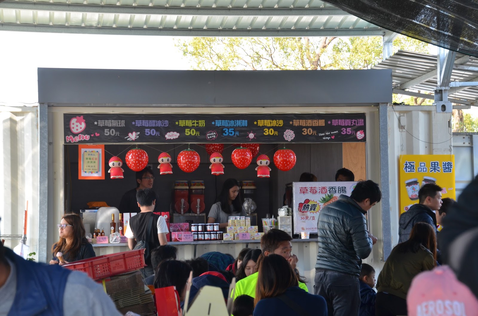 台中就是很天氣好啊!但是怕熱怎麼辦?沒關係老闆有搭一個超大棚子唷!可以在這邊立刻洗摘好的草莓吃,也有草莓商店,草莓酒香腸、冰沙等等!不過人也真的是多到爆XD