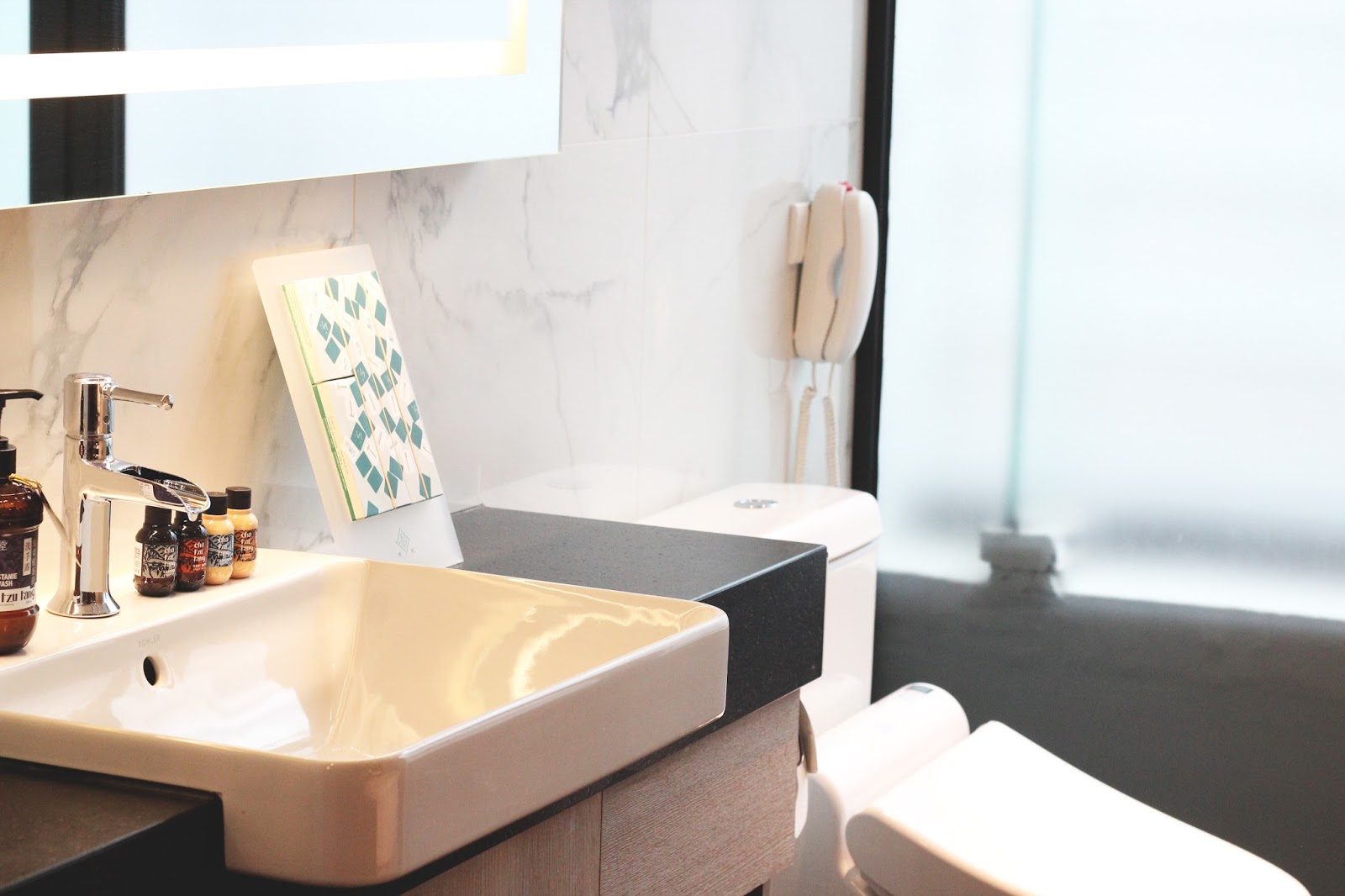 明亮潔白的浴室乾濕分離令人賞心悅目,牆面還是高雅的大理石磁磚喔!更了不起的是,盥洗用品是與茶籽堂合作