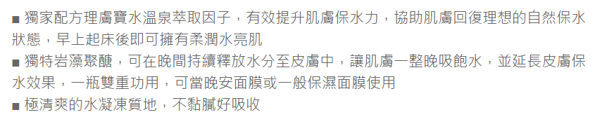 這款晚安凍膜含有溫泉萃取因子跟岩藻聚醣