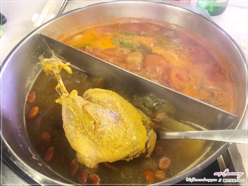 我們點了「蟲草花水鴨湯」+ 「蕃茄薯仔湯」。店定特別推介他們鴨湯用了很多小時煲成,上枱時已有鴨腿於鍋中。未落火鍋料之前,先飲鴨湯,湯底鴨味濃郁,又不油膩。