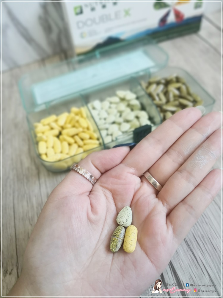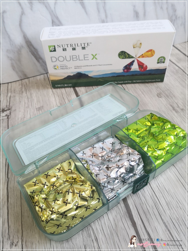 紐崔萊為都市人補充日常營養不足,一盒【紐崔萊Nutrilite Double X多寶維他命營養片】有3款的維他命營養片各62粒,足以一個月分量。
