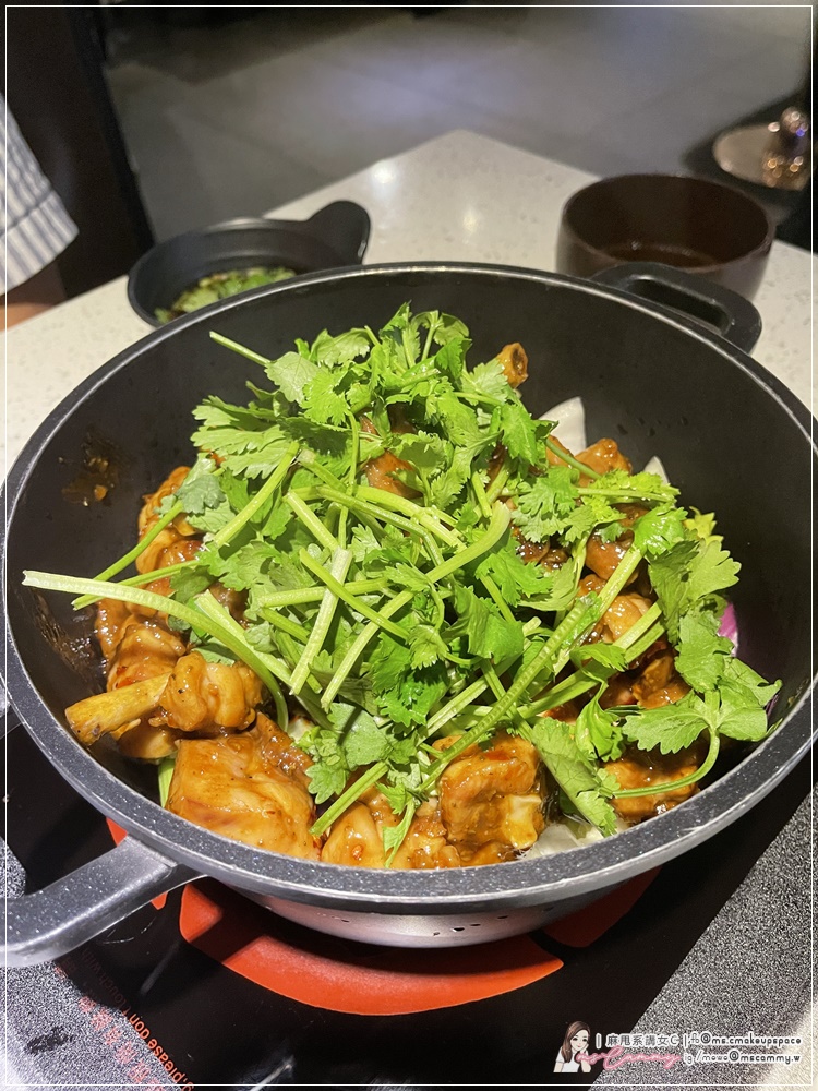 我們點了小份「火焰麻辣雞煲」(2-3人)($168),都未點好雞煲配菜,用鐵煲上菜的雞煲就已經上枱。上菜後,Staff有叮囑不要打開蓋,讓雞煲先焗,Staff稍後會再處理。等了一會,Staff幫我們炒雞。入面已經有芹菜和芫茜,原來臨食之前會加上香油點火再炒,食前先看一場火焰表演外,雞煲香氣更加迫出。