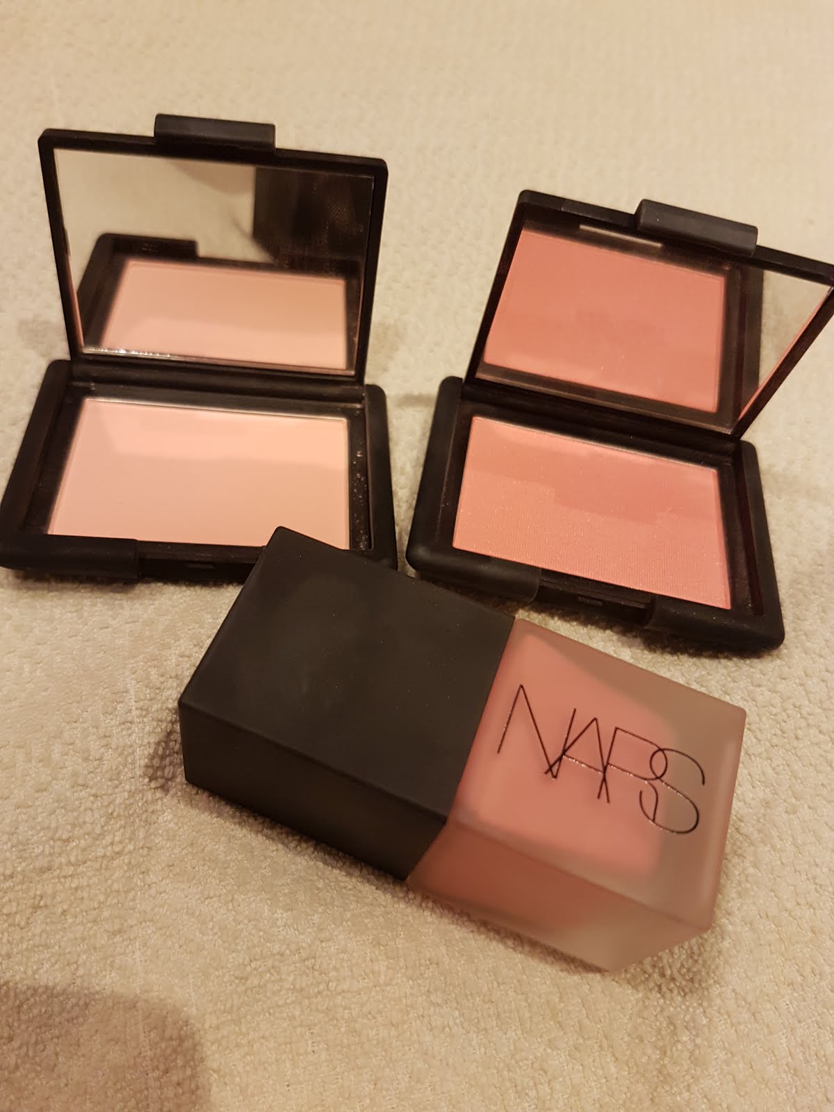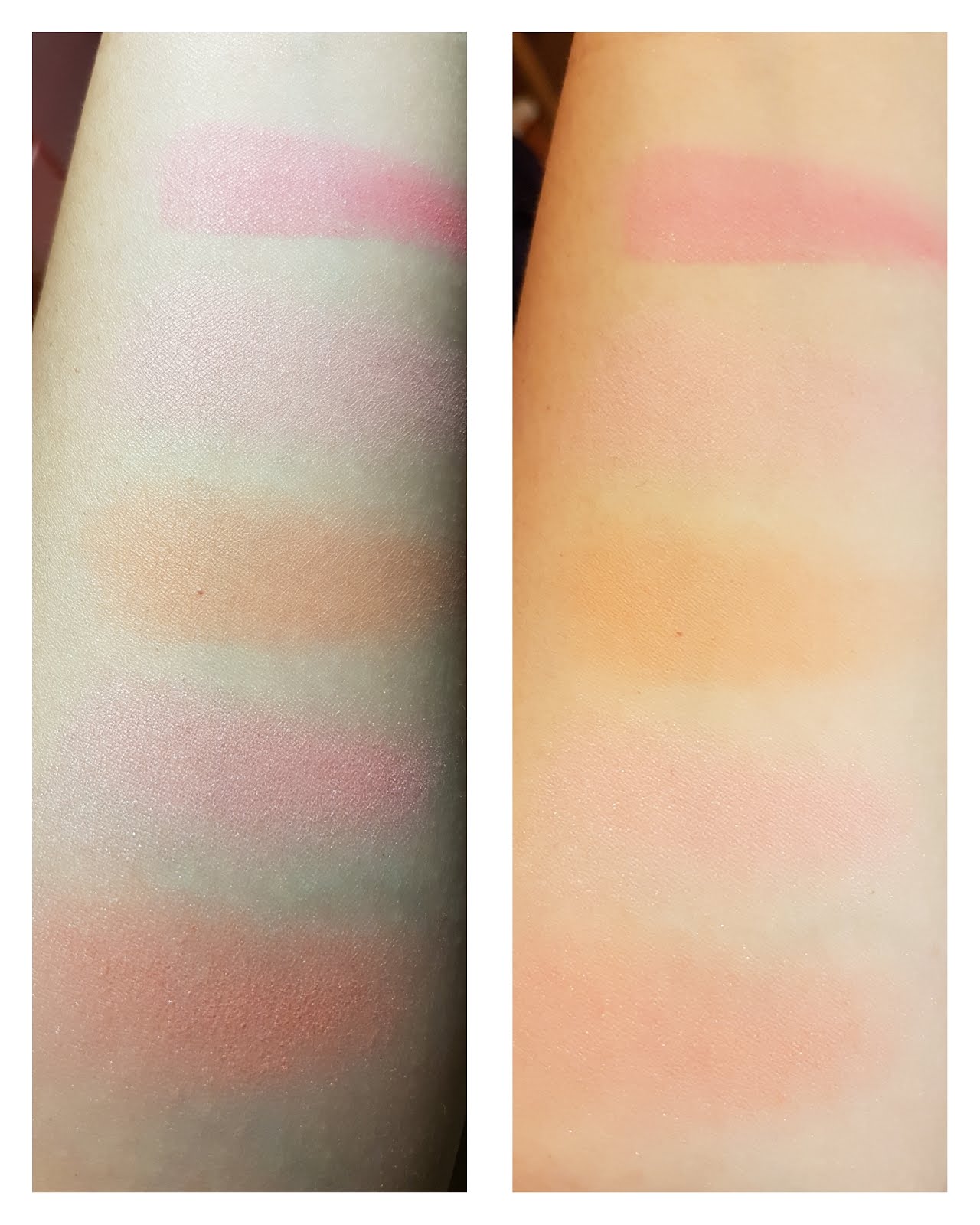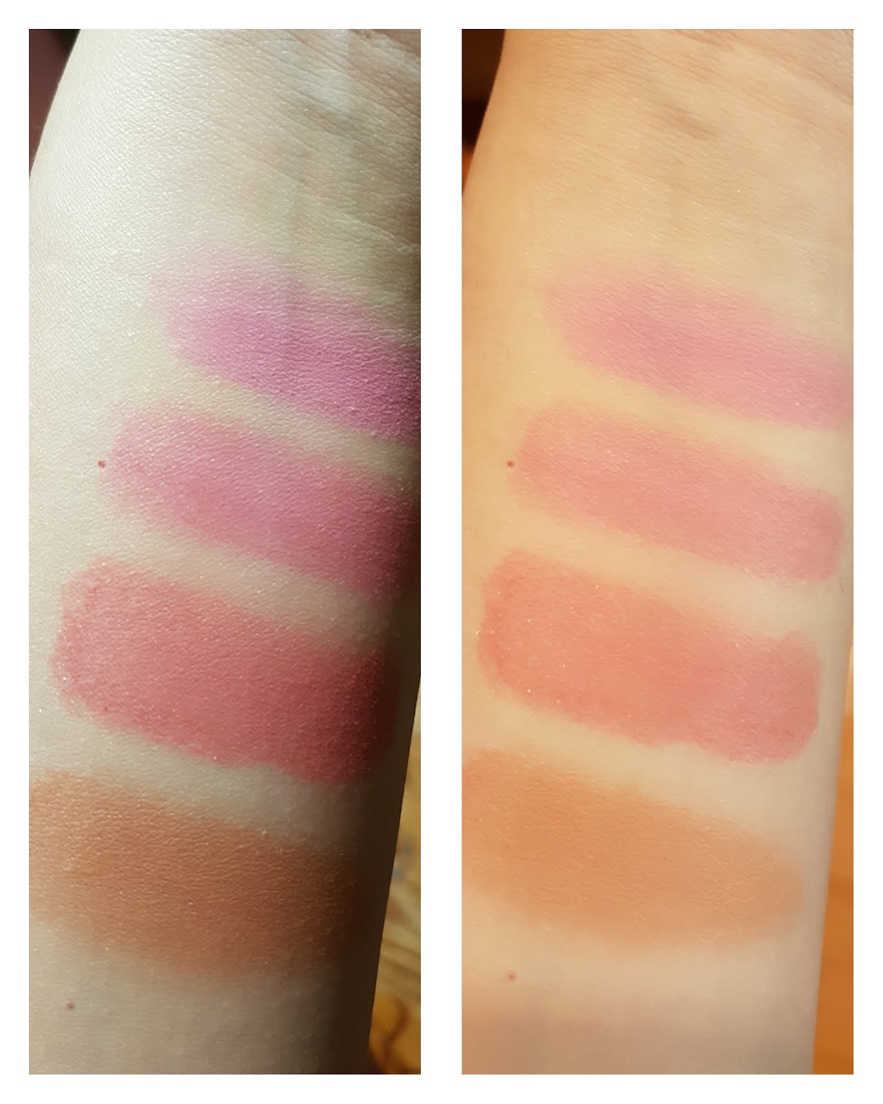 1-1. PK401 之前春天的限定櫻花色,很春天很日系少女的珠光桃粉色,用來畫眼下腮紅超級可愛 1-2. PK301 偏霧面(但還是有一點點光澤)的淺蜜桃色,很清淡日常所以不會失手,用來疊擦或暈染在腮紅外圍也相當適合。 1-3. OR302 和上一顆是有輕微光澤的偏霧面腮紅,夏天陽光感偏黃的橘色。 1-4. PK302 珠光滿滿的淺粉色,是個超級少女超級夢幻的顏色,需要擁有一顆少女的心才撐得起來 XD 1-5. RD303 一樣珠光滿滿(是銀色很細的亮粉),很襯氣色、有點粉彩感的橘紅色,私以為是這系列最不挑膚色的一個色號~