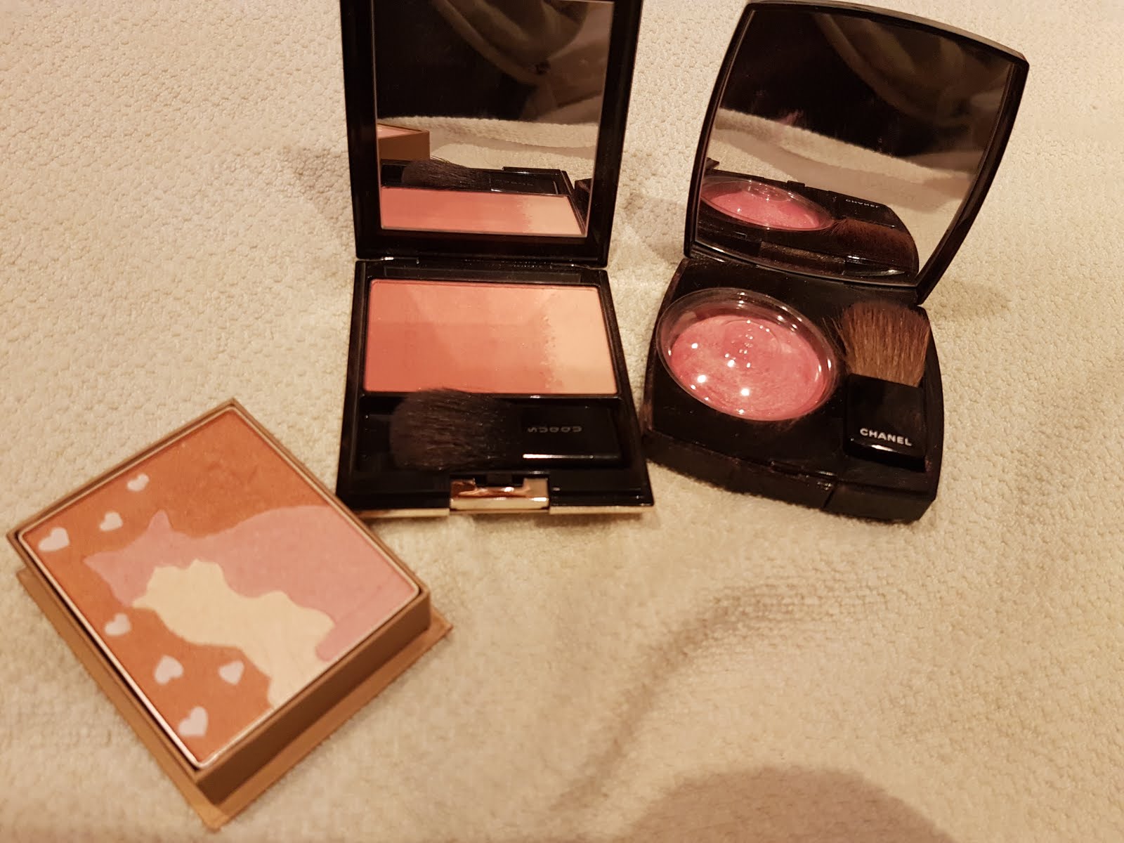 滿滿金色細緻亮粉的暖調玫瑰色,閃著金色但不奢華、反而有些波光粼粼的感覺。然後會顯得蘋果肌很蓬潤。有著濃濃的 chanel 山茶花香味。