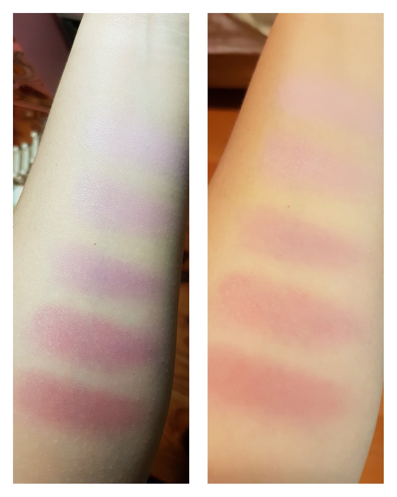 紫粉色和紫紅色的組合,混刷顏色就是偏紫的深粉紅色。最深的那一格當眼影也是很實用美麗的顏色。
