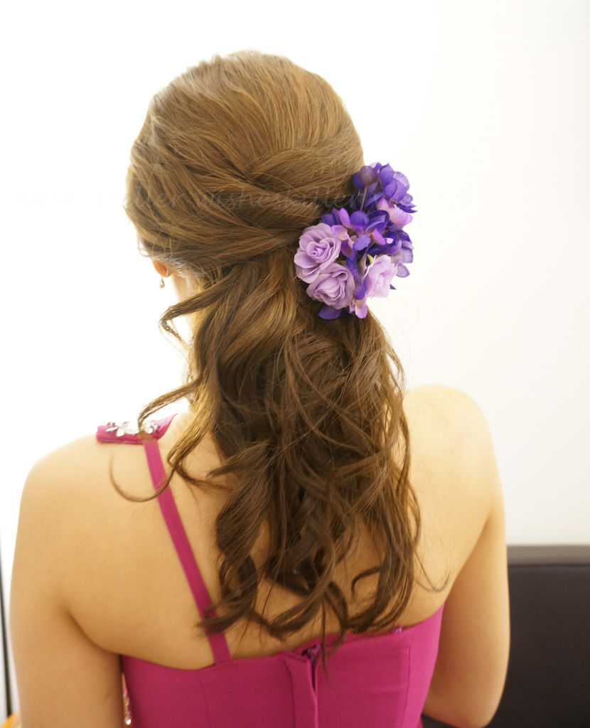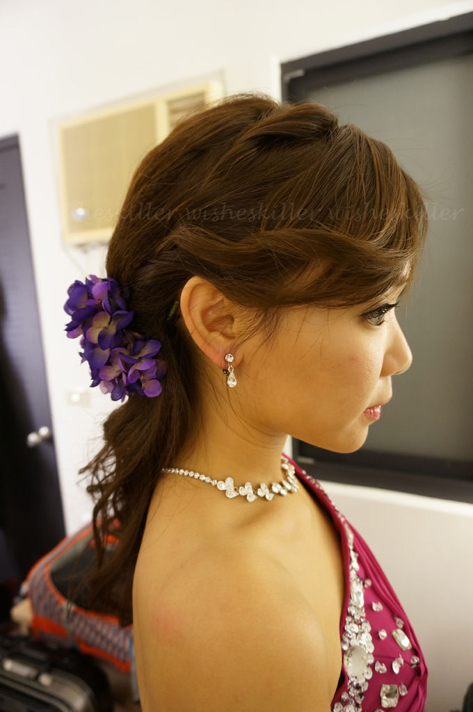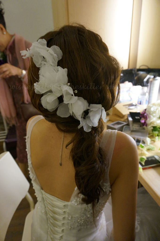 單股往後中心收成公主頭, 搭配一些花朵造型的髮飾, 後面 側面都美麗