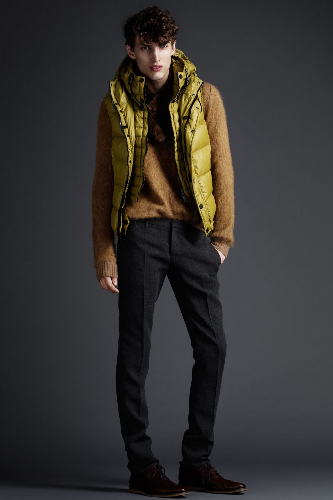 BBR很喜歡運用內搭來玩層次,左邊的西外在劍領運用不一樣材質在袖子特加上羅紋,給你大拇指 右邊的亮絨毛晚上在沒燈的馬路上應該不能當反光裝保護自己,但不置可否的質感沒話說,內搭毛衣亮起來 quoted from Vogue.uk |