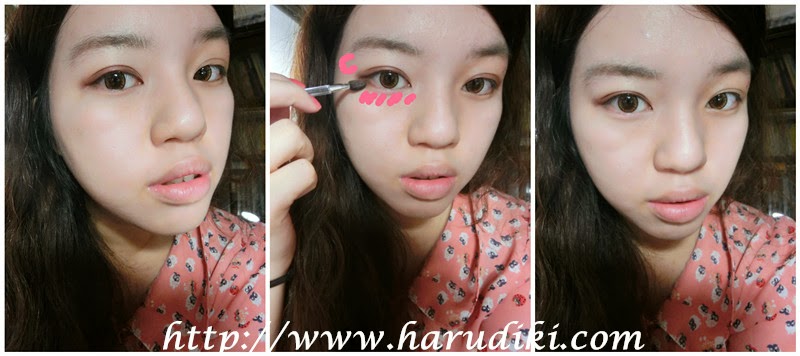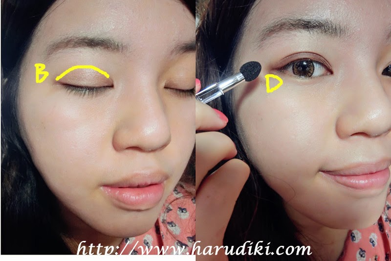 2.再用D比較深的布朗尼色化在眼皮的摺線內,可以微微延伸到眼尾