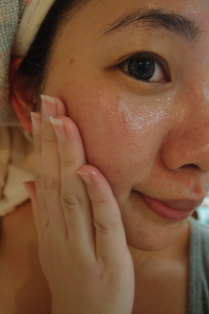 很快的就吸收了,皮膚會透出光澤,而且紅通通,但不是過敏的那種紅.