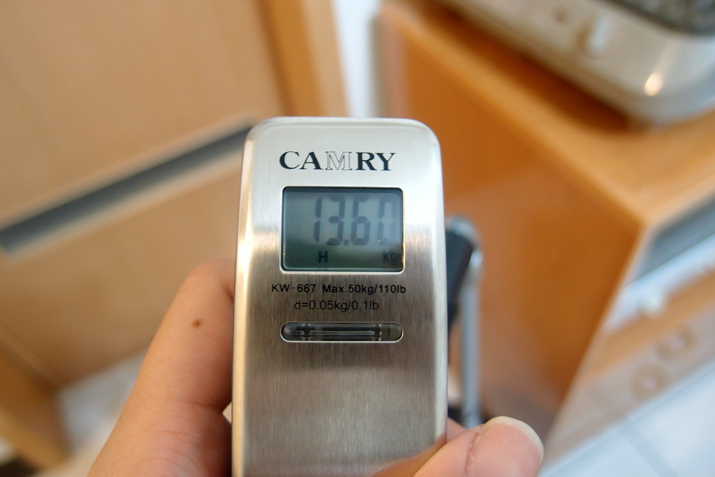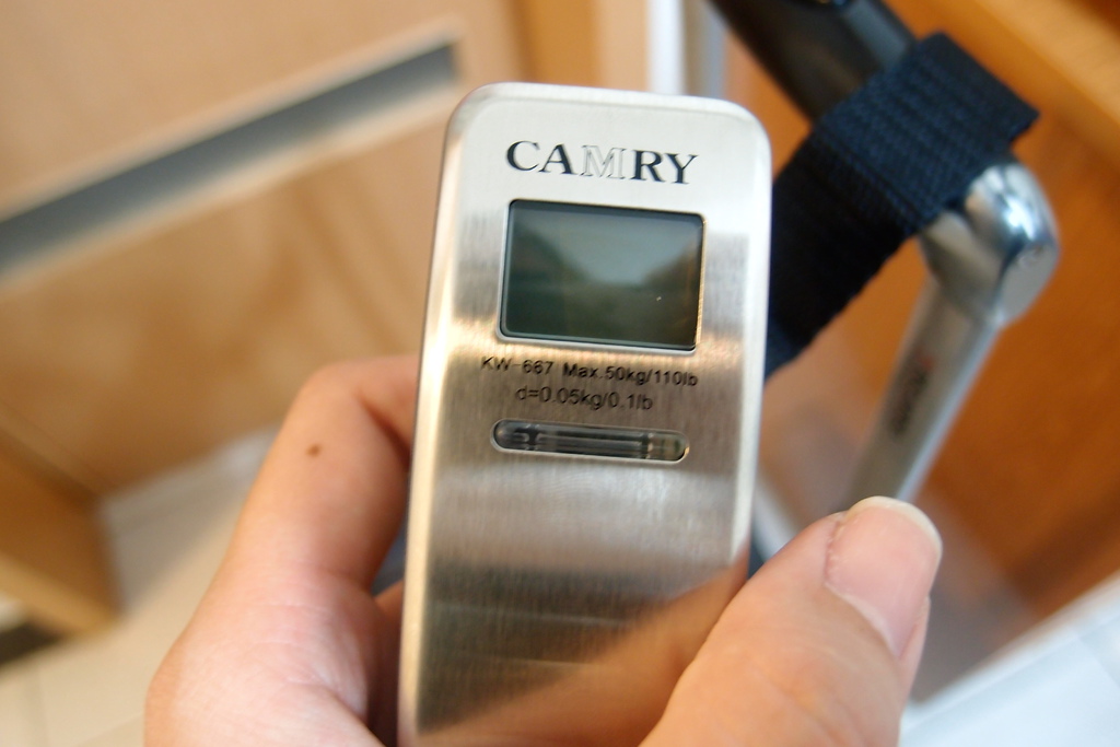 按中間的鍵將它歸零,往上提平衡一下就能知道行李重量囉!