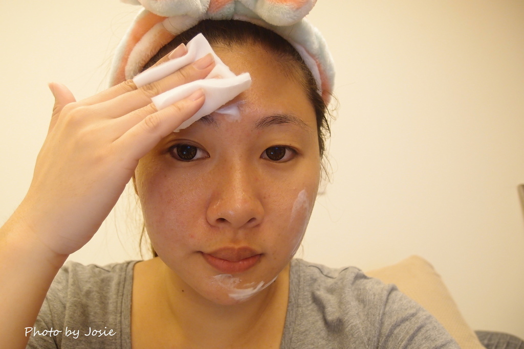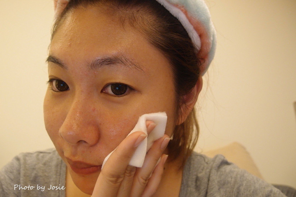 用化妝棉上滲透乳點完全臉開始劃圓式的按摩.