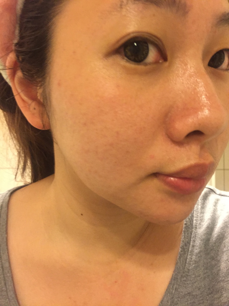 但泛紅及蠟黃的情況退去許多,紅紅的痘印有消除一些