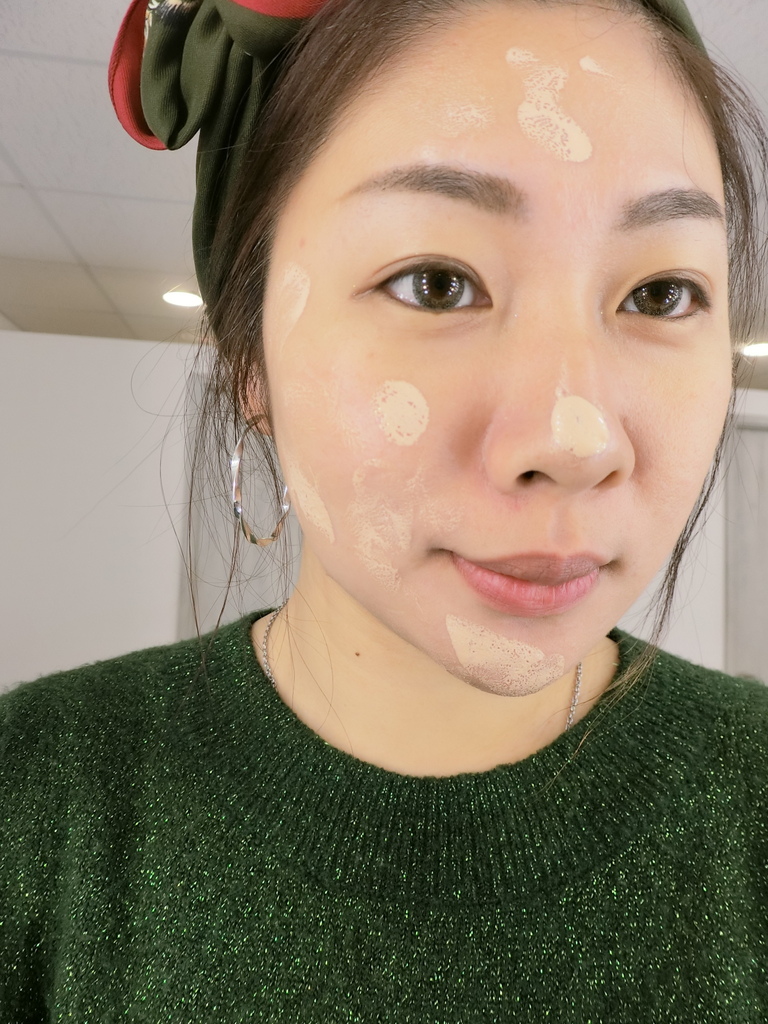 選擇喜歡的粉底,用點壓的方式上在臉上後推開