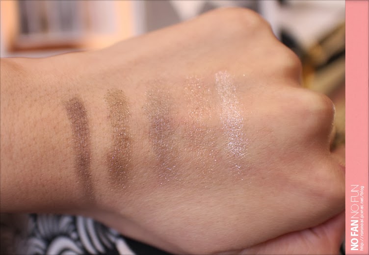 共5色眼影,由深至淺2種深色帶有珠光感,能讓眼妝有層次,3種淺色帶有星片,增加明亮感卻看起來不浮腫!