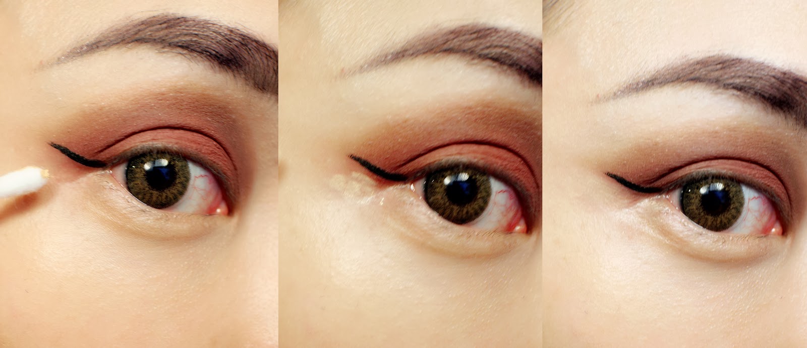 Stpe 8.步驟 > 如果上下眼尾處的三角開口,被眼影用髒髒得怎麼辦?沒關係,你可以沾取一點粉底液在棉花棒上