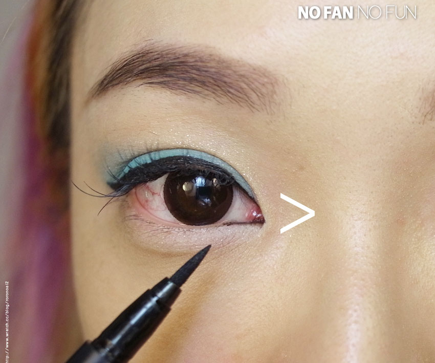下眼線的部分比較有趣一點,畫出一個>型眼線,從眼頭處畫出約快1cm的眼線