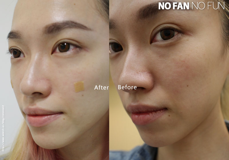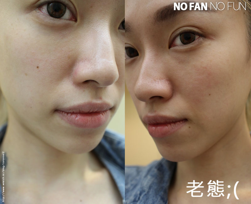 先來看看打完一邊臉的效果,因為我兩邊臉型不太一樣,所以我們拿前面的照片做對比