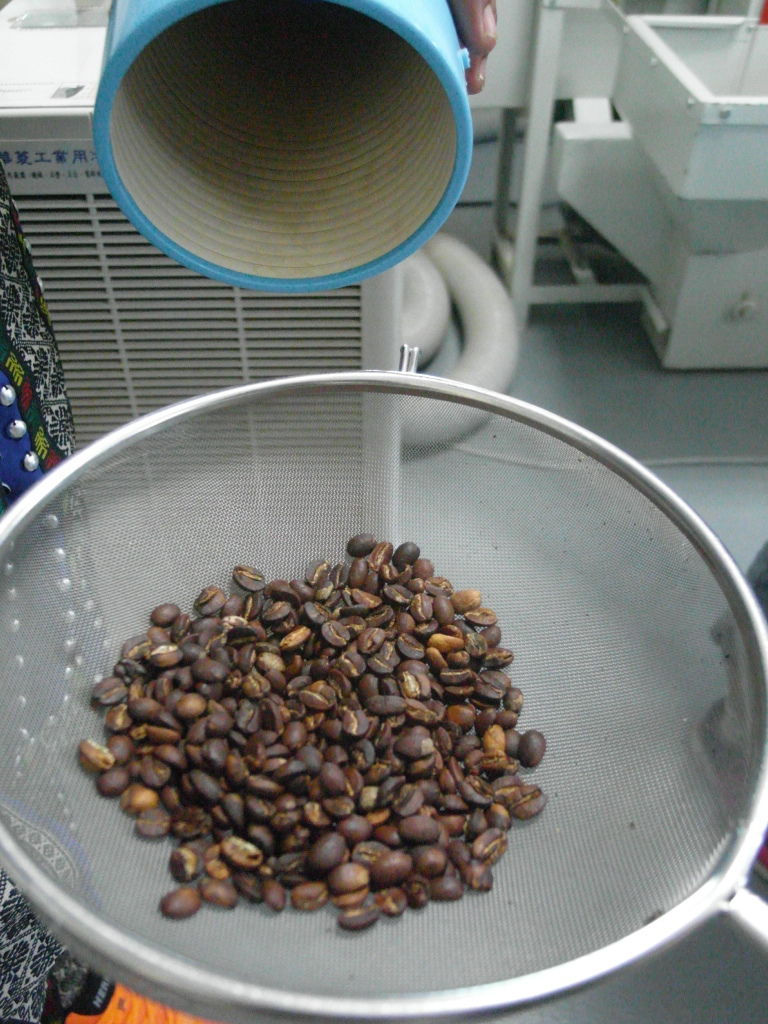 我們這組烘的是中度烘焙,與老師烘的作對照,好像還像樣XD烘的時候要不斷的翻攪,讓咖啡豆烘焙受熱的熱度均勻,否則有些咖啡豆會燒焦變黑。