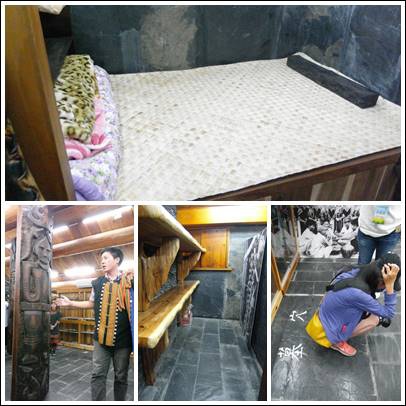 上為頭目床,下中為排灣族駐所內牲畜棲息處,下右為室內窩一深坑,一家人共用一墓穴,呈蹲姿狀埋入。