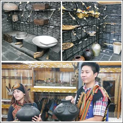 左上為廚房,右上為穀物倉,擺放小米、紅藜等,下圖女生拿的為母壺(上有乳狀突出),男生拿的為公壺(上有百步蛇),很容易分辨。