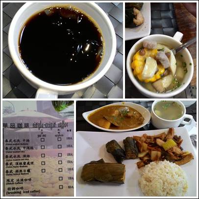 我點的是泰式頂級蜜處理,非常濃醇、微酸,還帶有一點果香,湯裡面都是滿滿的杏鮑菇,套餐飯上面混雜有一些小米,配菜是吉拿富、黃咖哩。第一次吃到排灣族的粽子-吉拿富,我覺得好特別!沒有品嚐過的一定要來吃吃看,以甲酸漿葉包覆著糯米、豬肉。