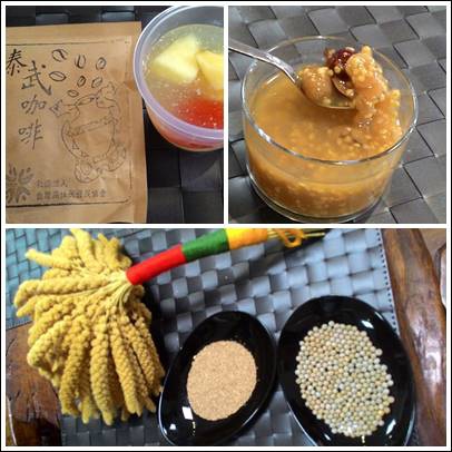 左上是每個人拿到的自己烘焙的咖啡,右上為小米紅棗甜湯,下為小米、紅藜。