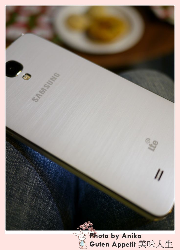 GALAXY J晶玉白的背蓋是特別的髮絲紋理金屬材質
