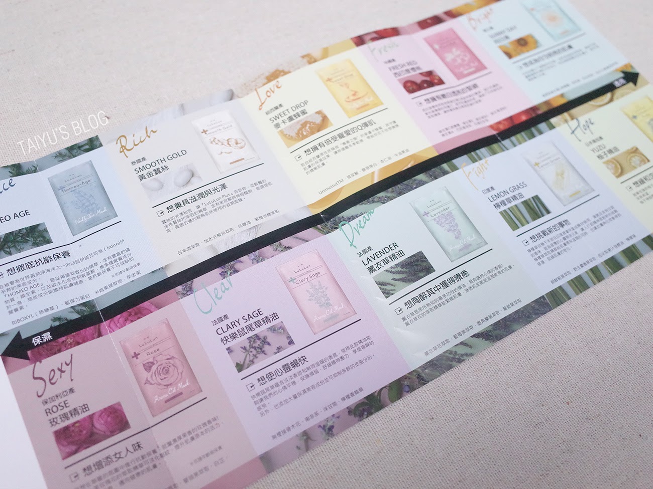 面膜有十種款式:玫瑰、快樂鼠尾草、薰衣草、檸檬草、柚子