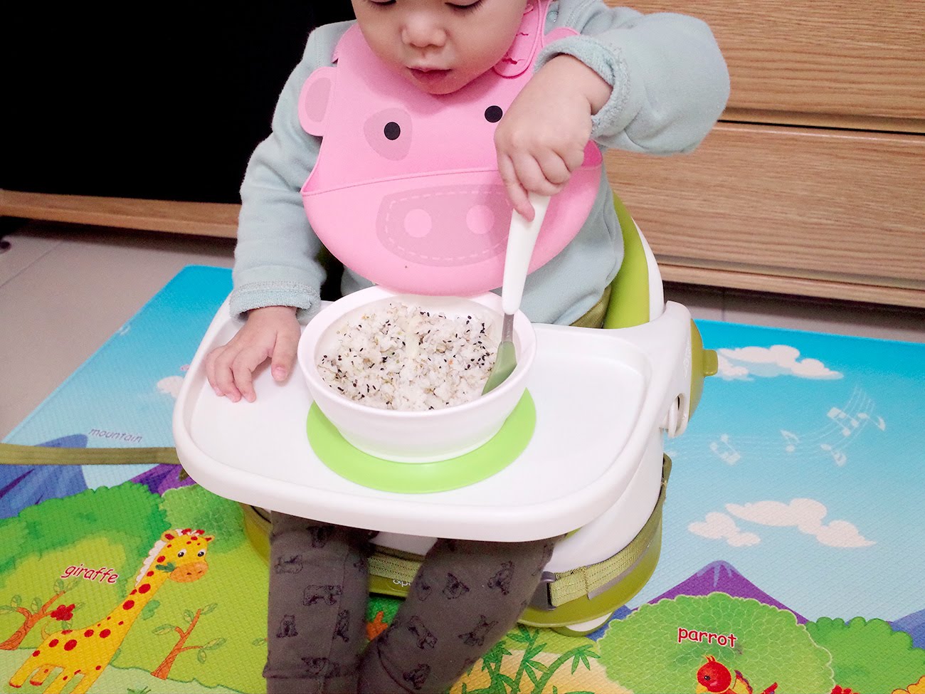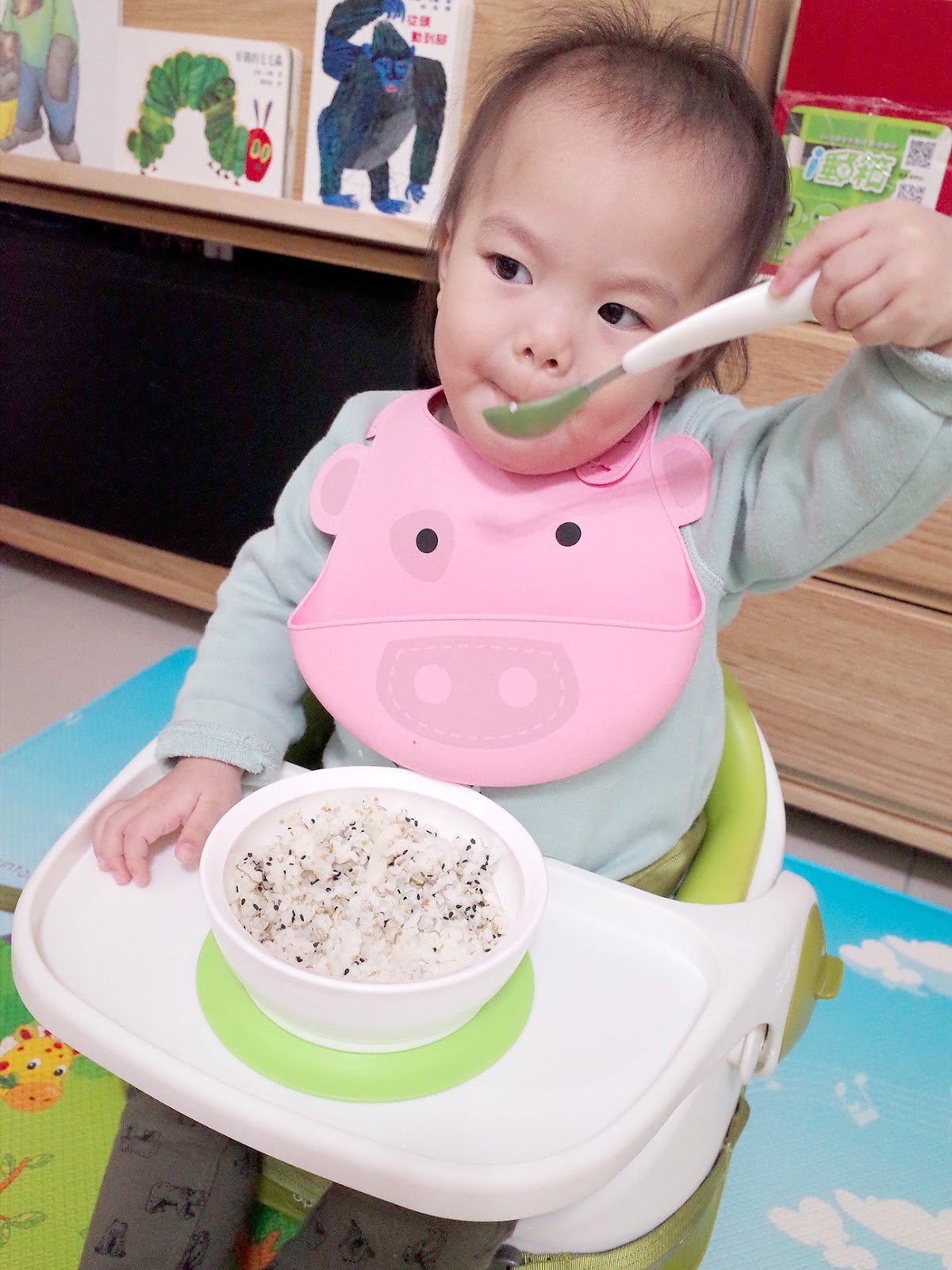 魚子大概從一歲左右開始讓他自己練習吃飯,