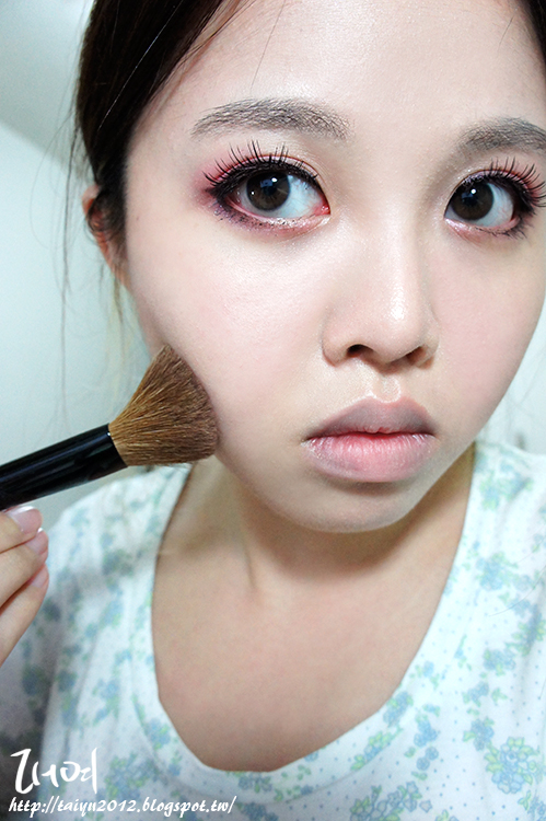 好的,因為使用了粉色的眼影,所以選擇了橘色的彩頰,