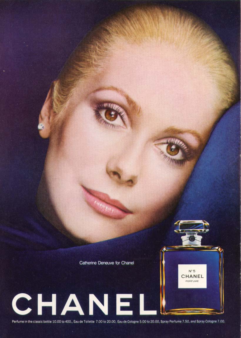 相信Chanel香水名字的由來大家已經知道的很煩,但生性賤皮的我就是要再煩大家一次,為何要叫No5呢?原因就是當調香師拿6瓶香水給Coco Chanel太太聞香時,她老太太很喜歡第5號香水所以就叫No5了,而第一隻No5的香水廣告在1953年便已推出,但小女不才實在是找不到那麼古老的影片,所以呢我們的回顧展就先從1973年開始,1973年這支影片其實和近40年後的今天有異曲同工之妙,請來了曾被「Look」形象雜誌譽為「年度最美麗女人」封號的凱瑟琳丹妮芙(Catherine Deneuve)與布萊德彼特一樣碎碎念,說這瓶香水到底有多優秀多值得買。