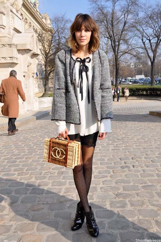 艾里珊穿衣一貫深色,黑白灰三色最常在她身上出現,看了她的街頭look book不下百張,發現她最常出現的單品就是毛衣、短裙和毛呢大衣,把上衣塞到裙子裡,外面再罩件大衣,手再拿一卡Alexa包(夠無聊了吧?),再不然,偶爾還會有一些印花洋裝和淺藍牛仔吊帶褲,出現一些宛如村姑或鄉村農場少女的造型,此外,對於她那頭捲曲中長髮,讓人只想和她說:「小姐請你出門要記得梳頭髮」。
