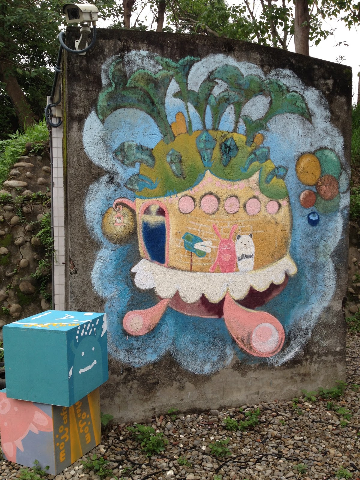 而「門內」最為搶眼的,莫過於正前方大大漆著彩繪圖樣的巨大水泥牆。
