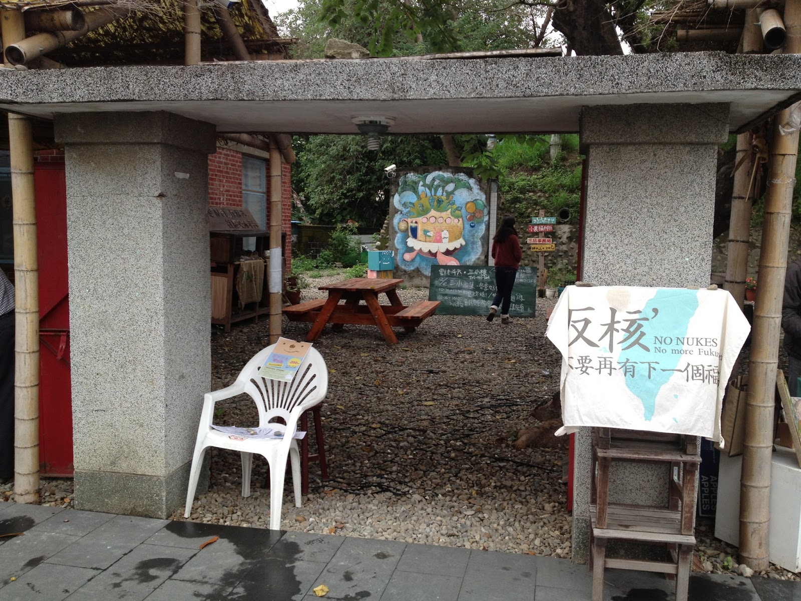 兩扇紅木門,大大敞開著,門柱邊放著反核的布條,門內是兩組木桌椅,