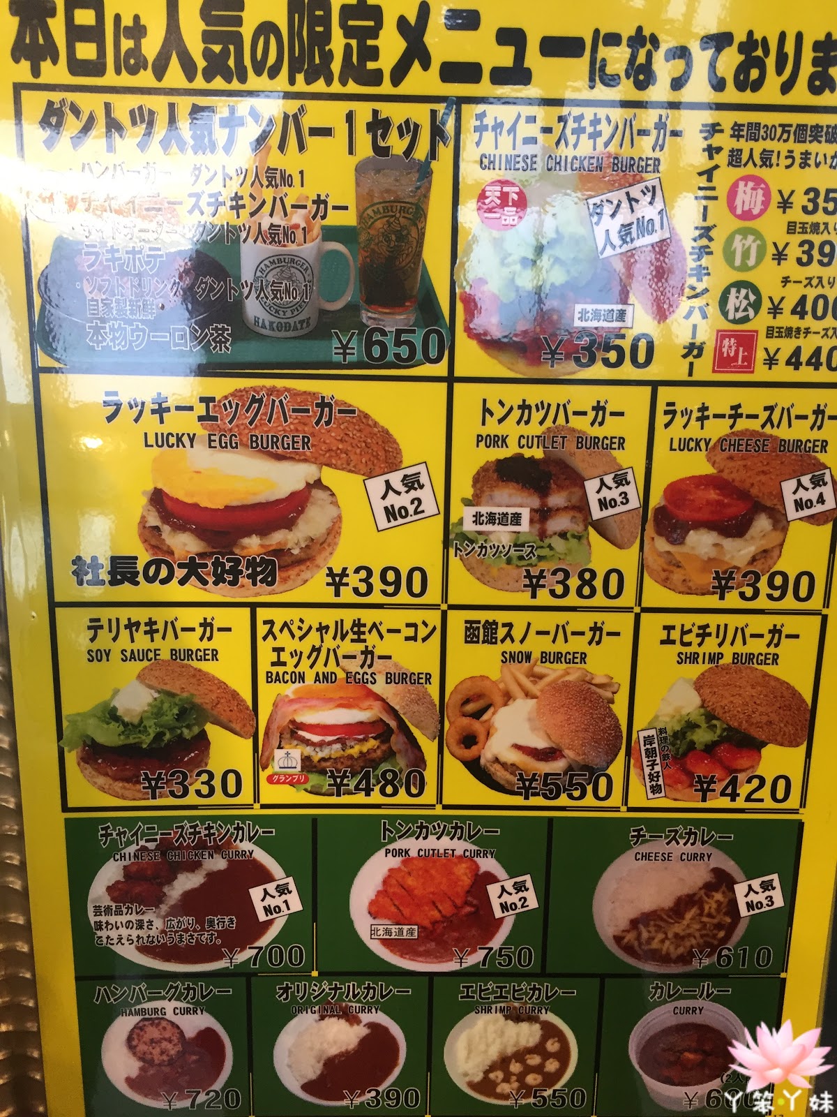 給了一張訂餐編號卡,上面有另一個空格,等找到位置後在補位置號,然後再把卡給點單的店員。店員就會開始準備送餐,速度實在是很快。尤其北斗門市又是這麼大間,很驚艷員工的工作效率。人氣王招牌是中華雞腿漢堡和豬肉蛋堡。這種加蛋在漢堡裡面,也真得是亞洲版的中華風漢堡! 想不到還有賣蛋包飯/咖哩和大阪燒等。