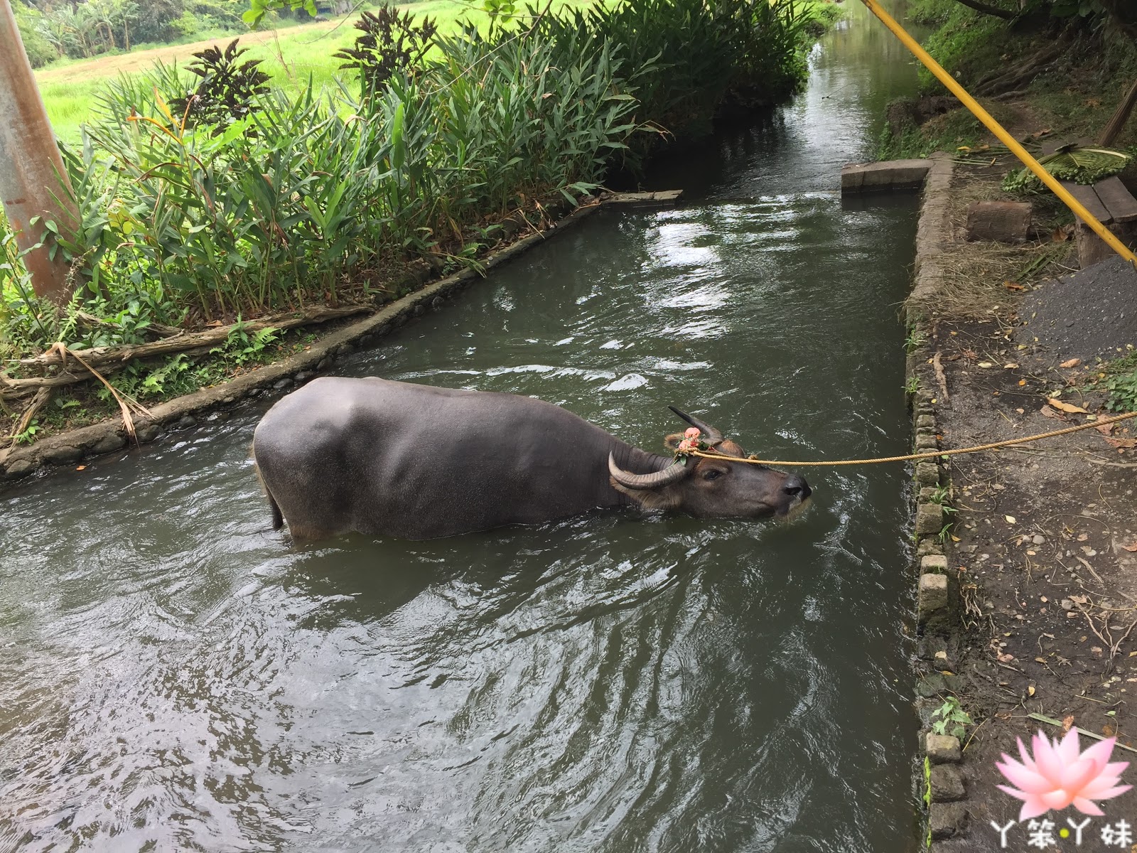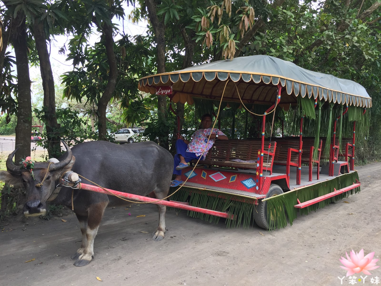 在搭乘水牛車Carabao Cart Ride 進入莊園內,伴隨著穿著在地菲律賓服裝員工親切的微笑,和隨性哼唱在地歌謠。