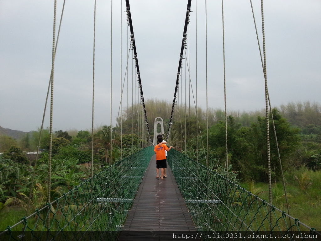 兒子提起勇氣走到吊橋中段了,勇敢餒(拍拍手)