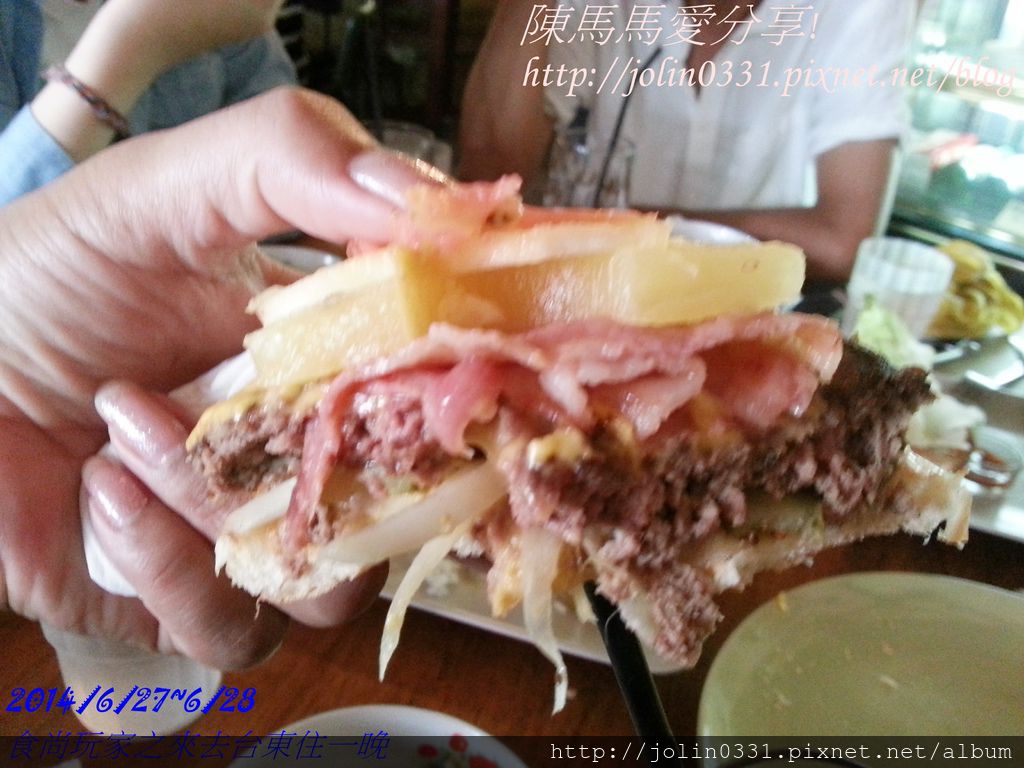你看看~這漢堡好厚好高喔~不加上下層麵包的話,好像有九層喲~