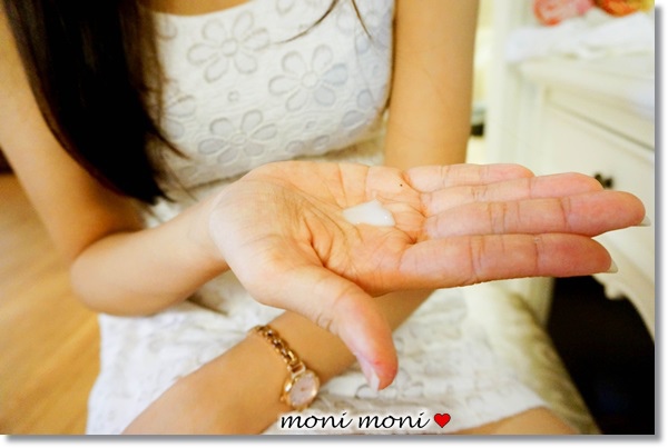 擠出來呈現白色的不透明乳液狀,均勻的擦在頭髮上。