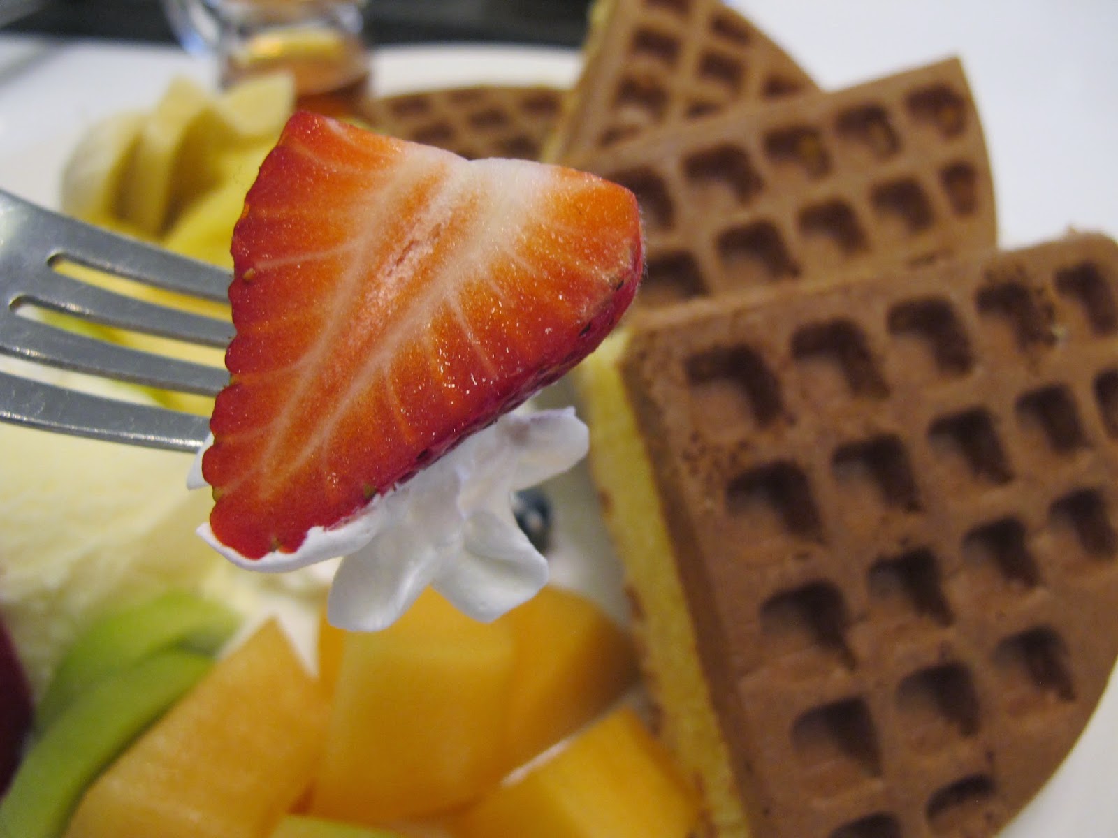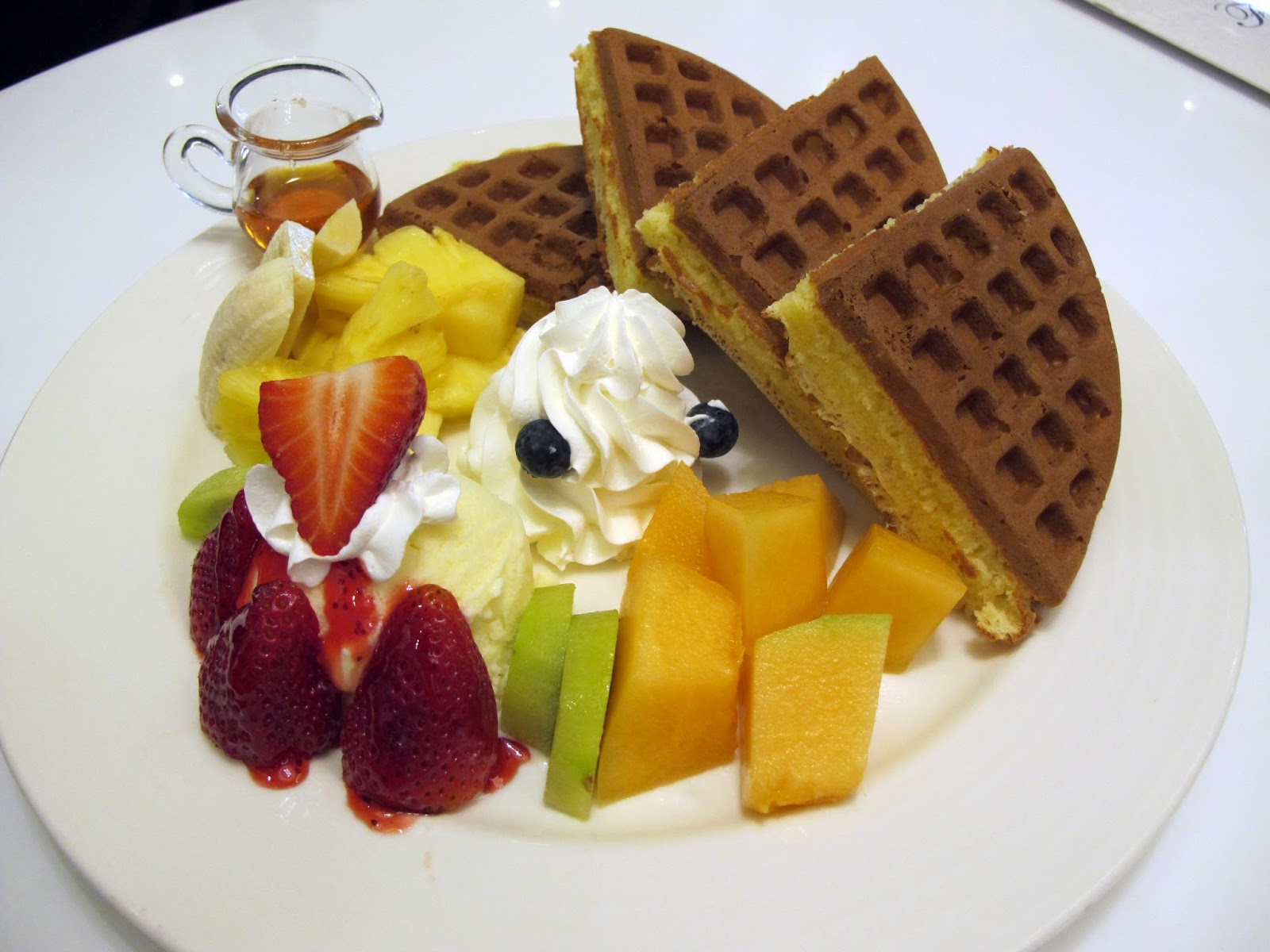 新鮮水果的冰淇淋鬆餅,滿足了超級愛吃水果的我!剛端上時鬆餅還熱呼呼地冒著蒸騰熱氣!而水果的種類與數量真的是超級多的,進口草莓、香蕉、奇異果、哈密瓜、鳳梨、藍莓,每種都因熟度剛好而充滿水分,甜軟好吃,冰淇淋是香草口味的,另外一旁還搭配著一小壺蜂蜜,真是設想完整的一道甜點,由於份量有點多,兩人合吃剛好!