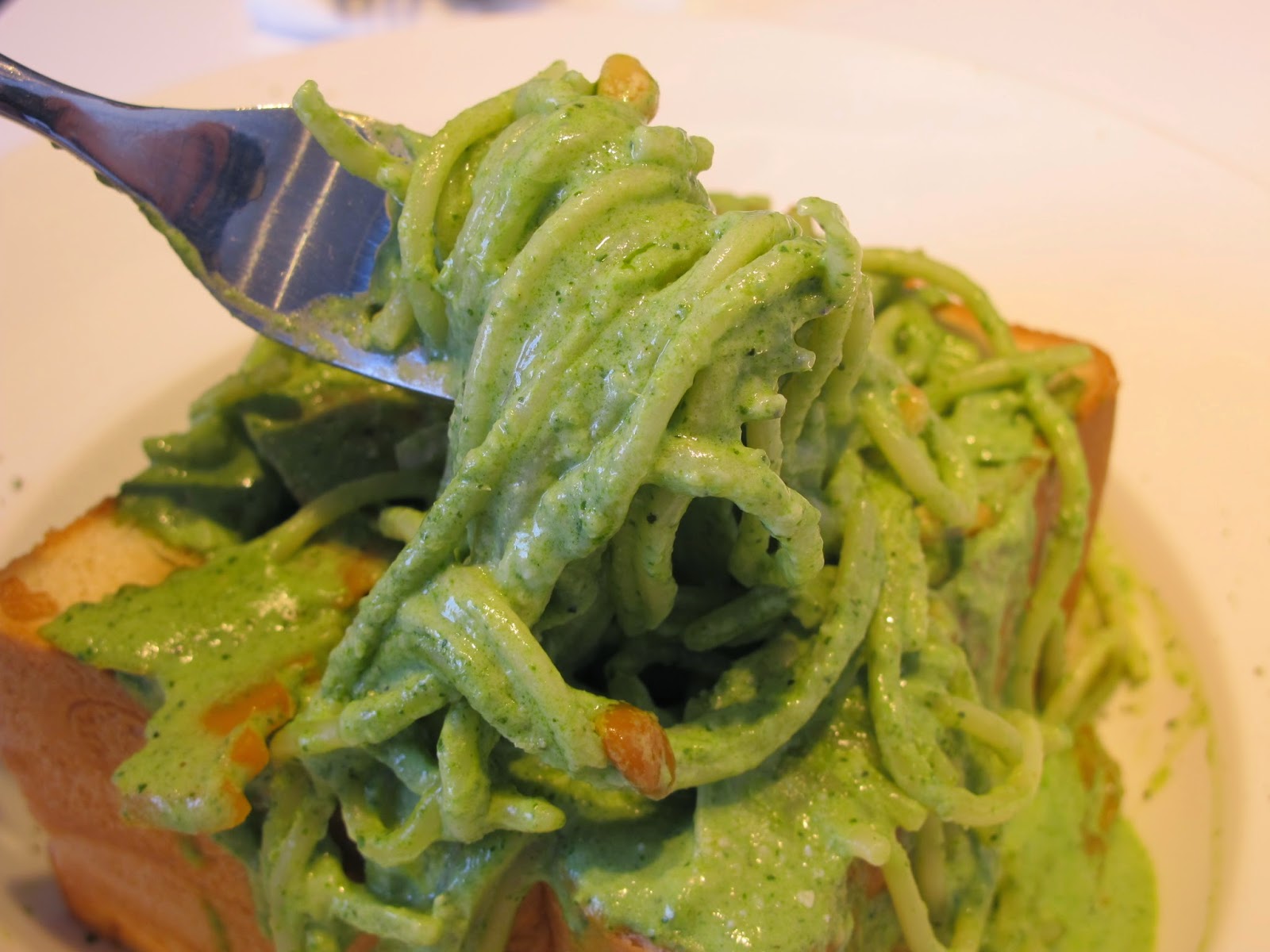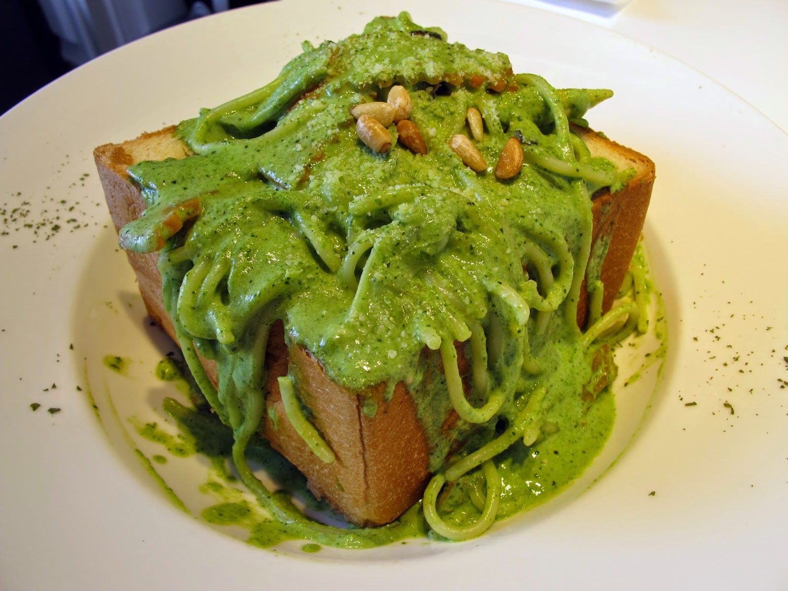 青醬野菇義大利麵盒子,以烤得酥脆的吐司麵包盒,裝入熱騰騰的青醬義大利麵,上頭還綴上幾粒高貴的松子,添加口感層次,吃到裡頭時才發現,蔬菜不只有野菇而已,還有脆脆的玉米筍,青醬不油不膩,搭上單純的蔬食口感與甜脆滋味,從來不知道沒有加肉的義大利麵,也可以那麼好吃,吃起來一點負擔也沒有。