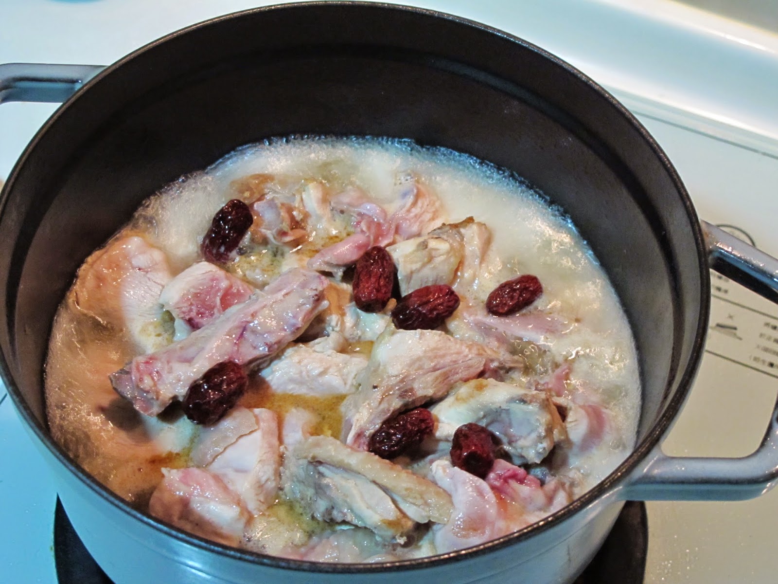 3.倒入米酒半瓶,並加水淹過雞肉。
