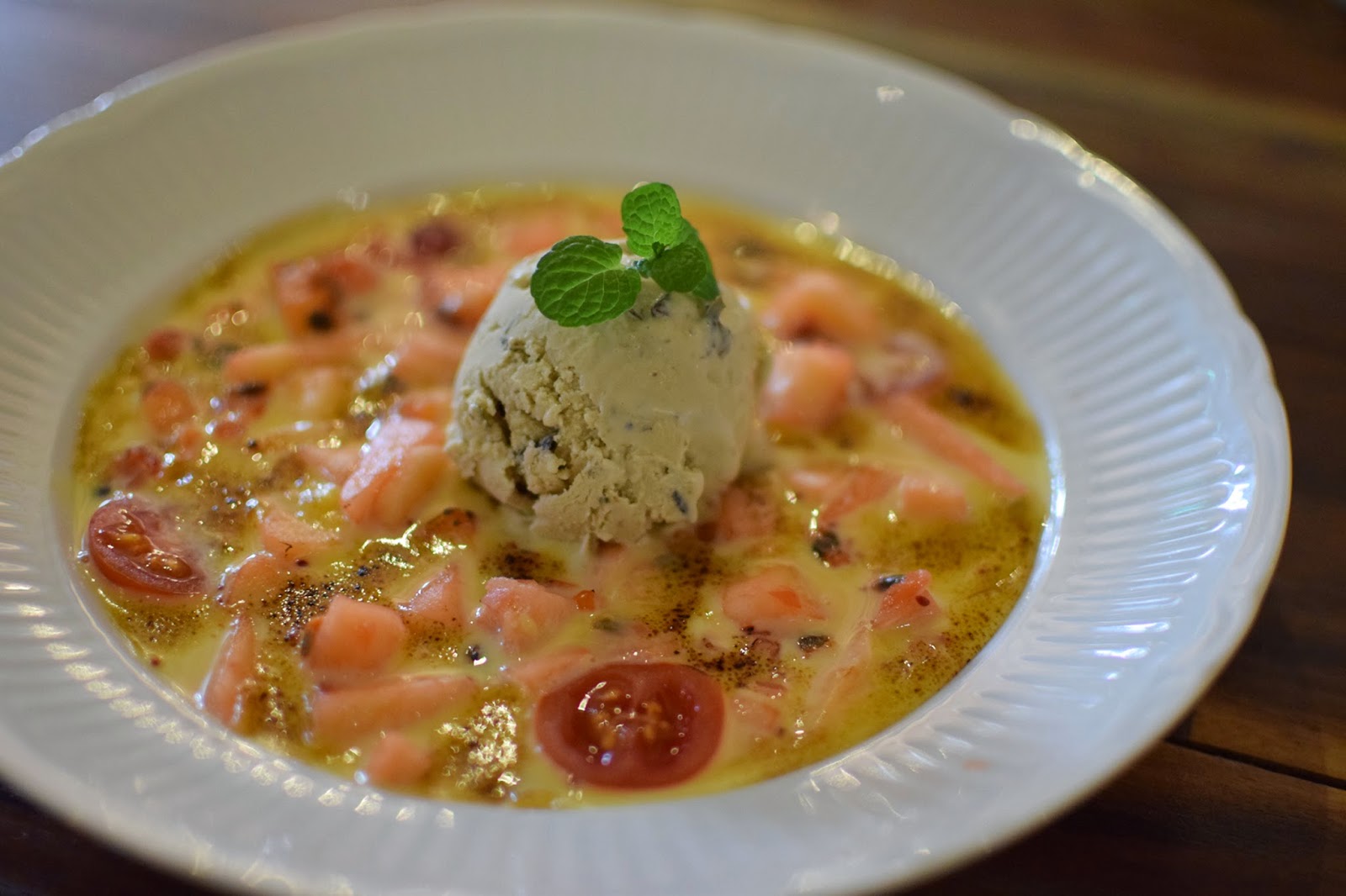 這份甜點看起來格外清新動人,小農新鮮水果淋上沙巴雍醬搭配冰淇淋,名稱倒是長得讓人難以記住,蘋果與蕃茄切成小方丁浸在奶油口味的濃郁甜醬汁中,搭配上一球充滿茶香的台灣鐵觀音茶冰淇淋,以醬汁的甜度去襯托冰淇淋的高雅茶香,喜歡甜食的我甚是喜歡,但男士可能會覺得甜過頭。