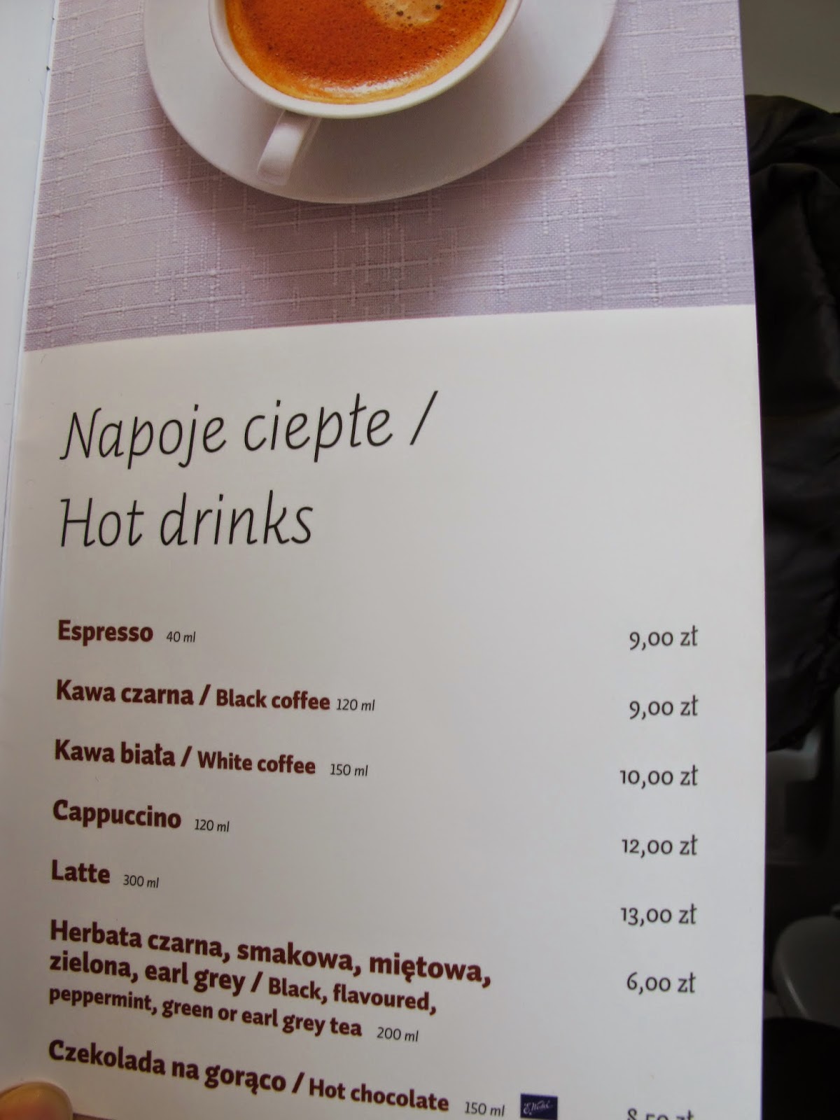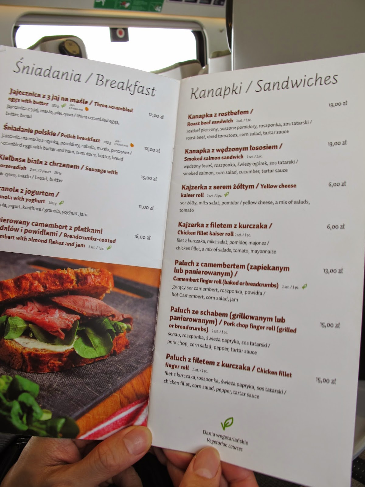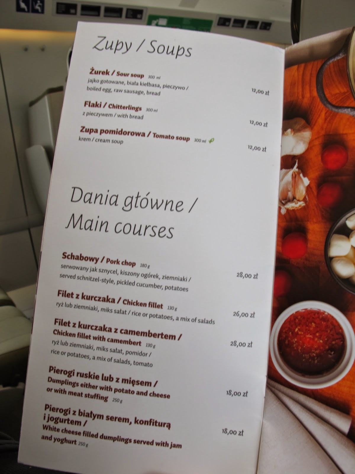 這列火車有一個餐車車廂,廣播中不斷提醒大家可以去餐車訂餐,他會將餐點送到你的座位。送完飲料不久,就有專人沿著車廂發菜單,然後稍後再回來詢問你是否要點餐。我研究了一下菜單,由於華沙的餐飲賣得不便宜,相較下火車上的餐飲價格還算平實而且菜式選擇眾多。