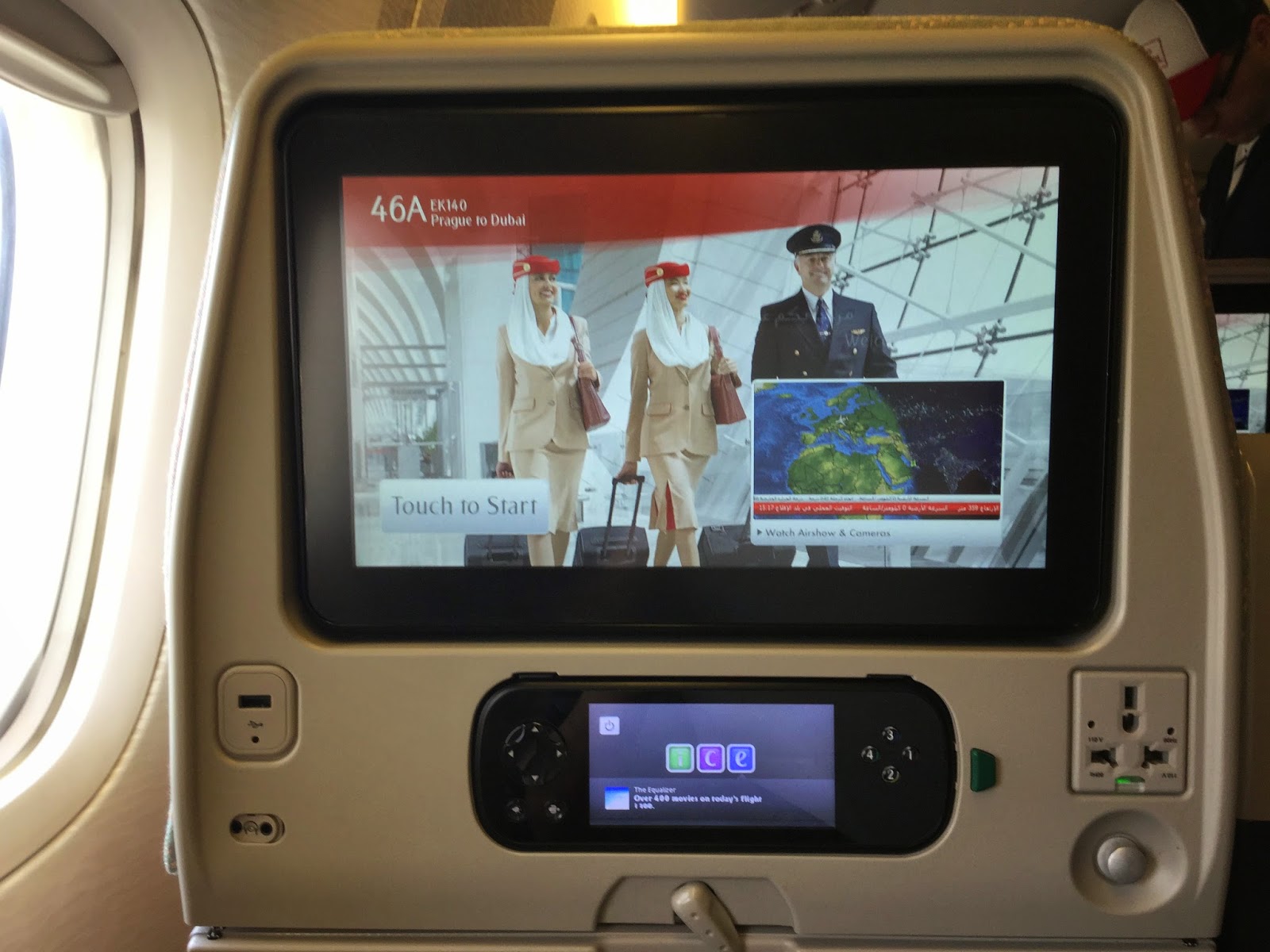 螢幕相當大,觸控功能也很靈敏好用!每個座位螢幕下方都有充電插座及USB插槽,台灣的插頭也適用,不需要轉接頭,就可直接充電。
