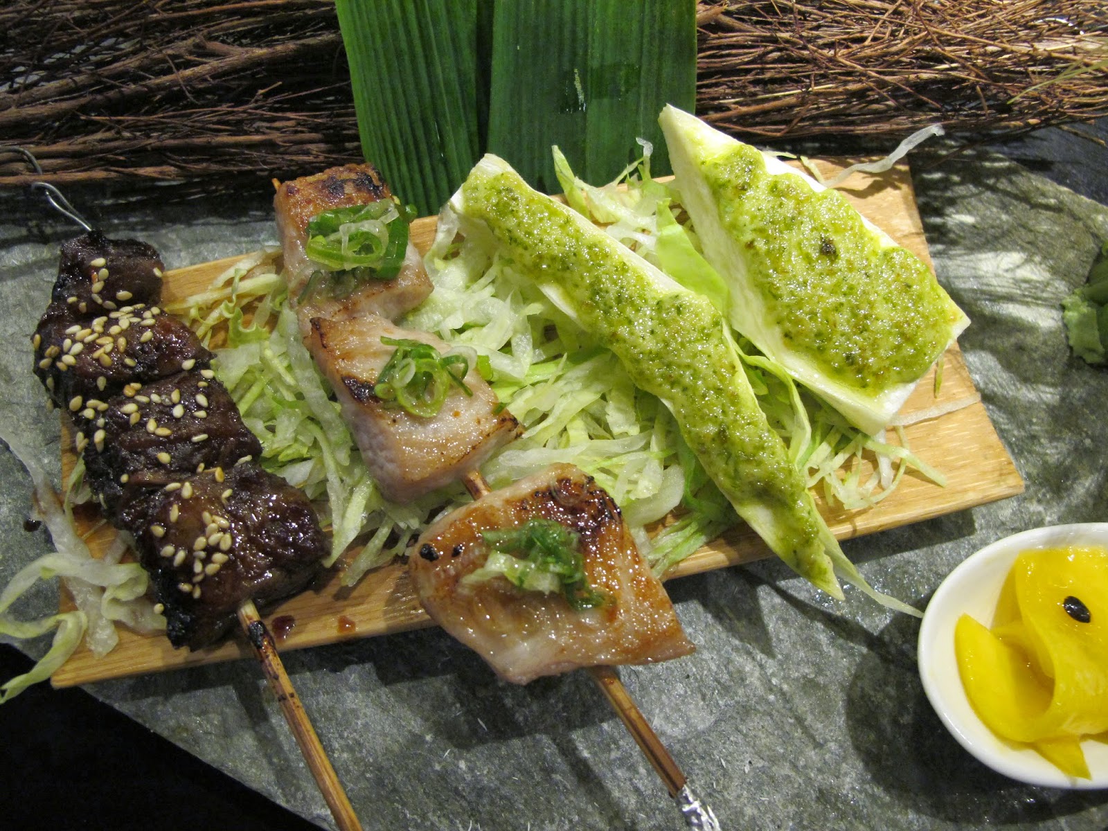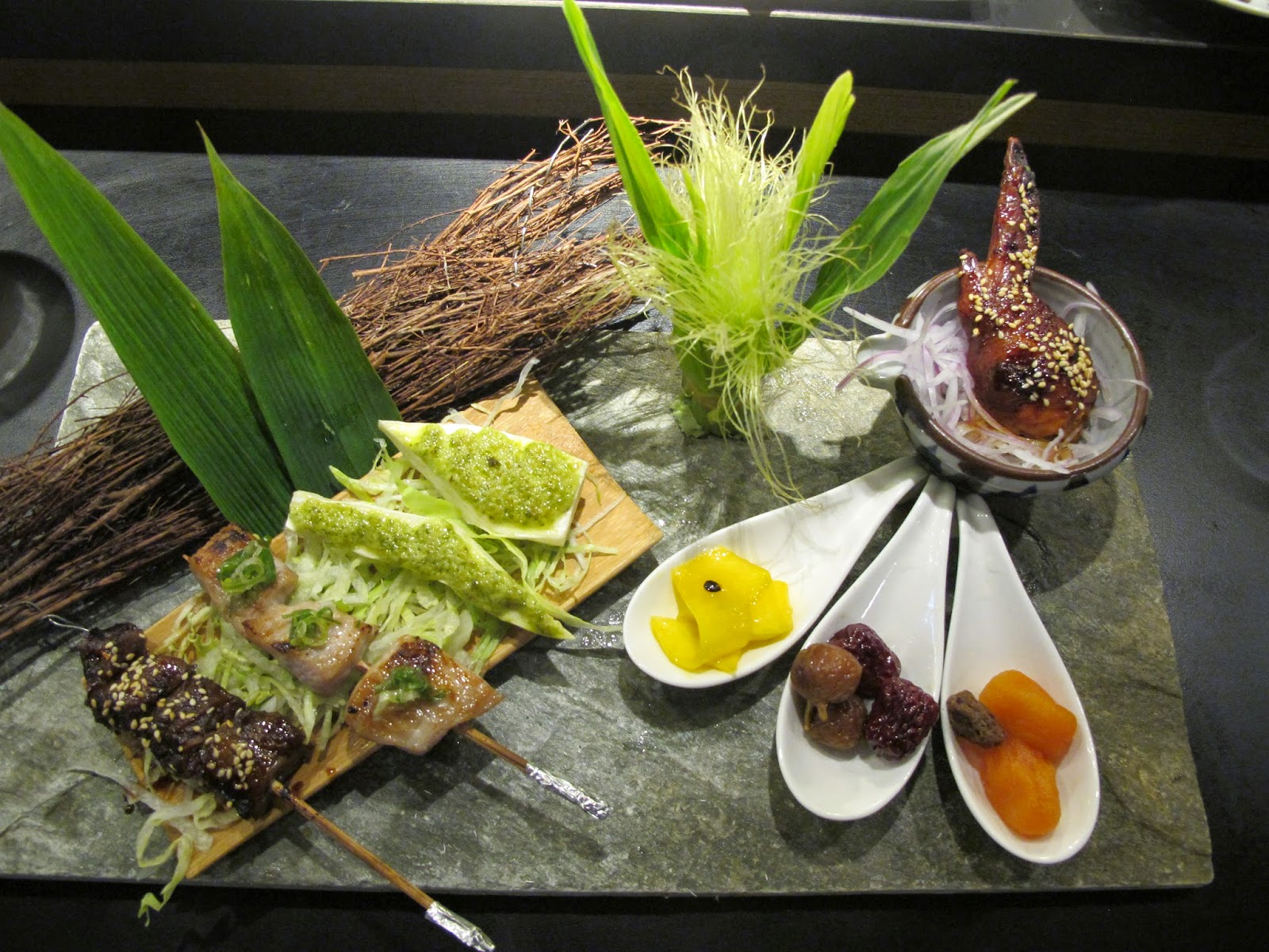 串燒也有很多選擇,松阪豬經炙烤過後表現帶著彈性的美味肉質,筊白筍清甜再綴上青醬,突現獨特異國的風味,明太子赤手羽不會過鹹而填滿明太子的紮實內餡,與雞皮的油脂交融成一種豐盈的美味,幾種番茄、青木瓜、紅棗、無花果做成的醃漬小物,剛好平衡吃完烤物後的味覺。
