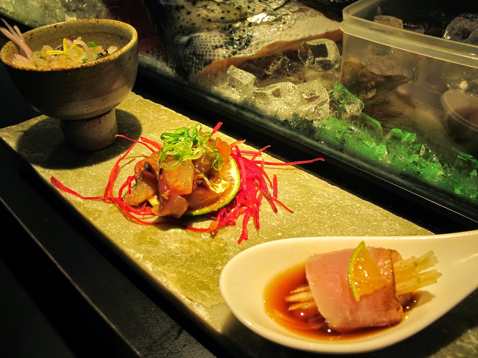 接著,這道前菜很驚豔的登場,水母做成的醋物有著爽脆彈牙的口感,中間的竹筴魚片味道調得恰到好處,入口即化,右側的金目鯛捲著水果,帶著檸檬香氣入口,形成非常輕盈的美味。
